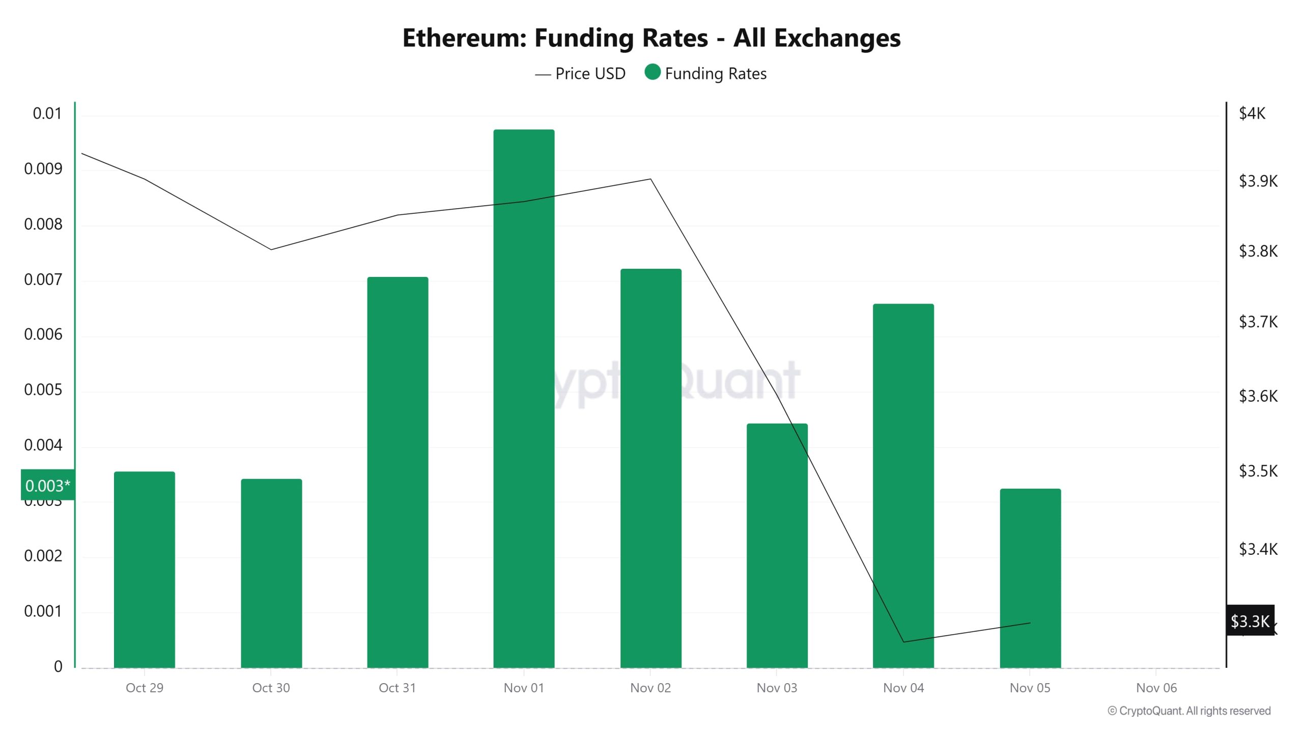 From the last days of October until November 2, the rise in funding rates in positive territory indicates that long positions predominantly dominate the market and that investors maintain their expectation of price increases. However, following November 3, the price fell from $3,900 to $3,030, accompanied by a sharp decline in funding rates. This trend reveals that leveraged long positions have begun to close and that the market has shifted to a more cautious stance.