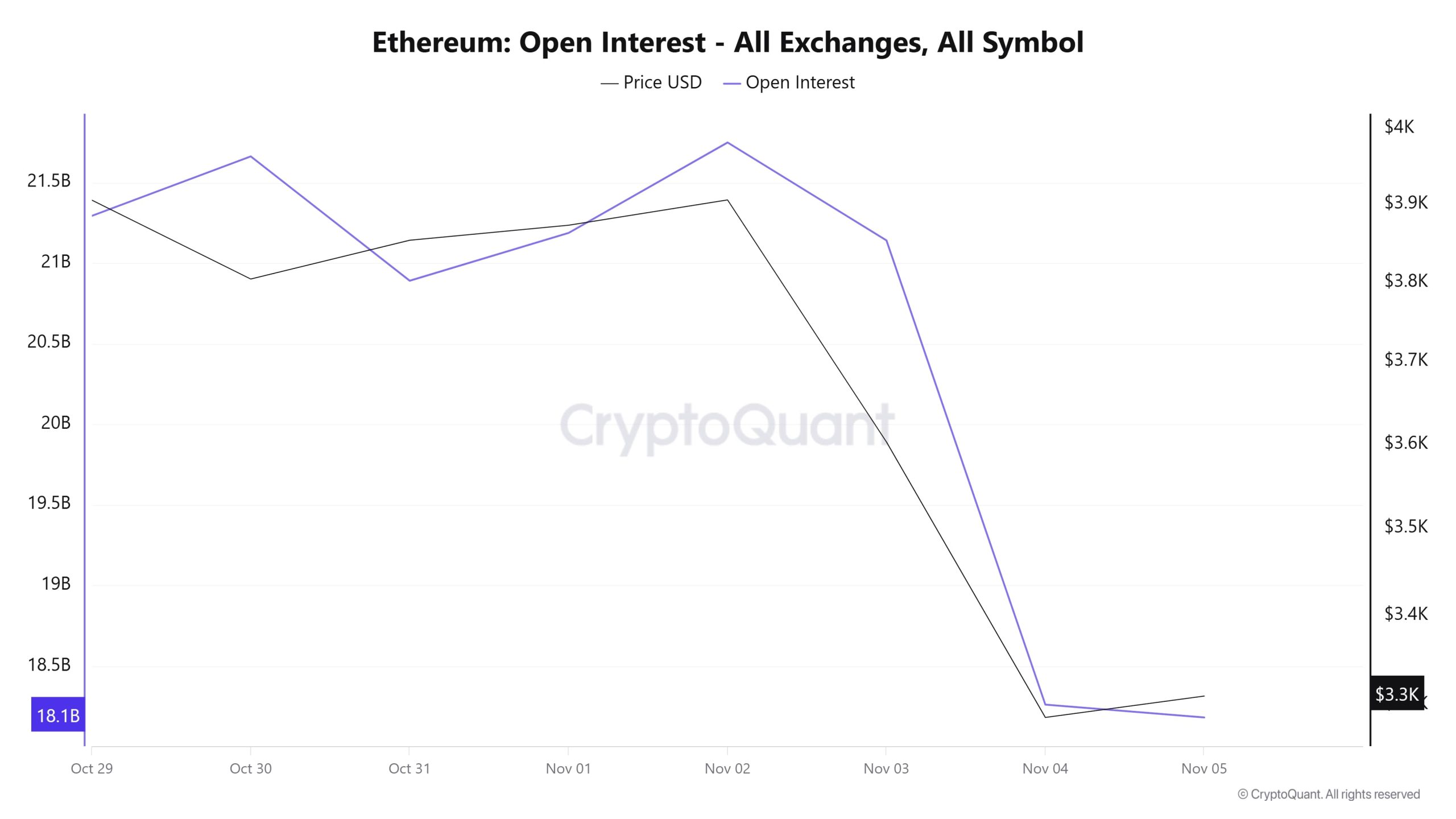 Until November 1, both prices and open interest were trending upward, indicating that new positions were being opened in the market and that investors were maintaining their bullish expectations. However, starting on November 2, the picture reversed. Both prices and open interest fell sharply, signaling a significant liquidation process on November 4. The decline in open interest from $21.5 billion to $18.1 billion indicates the closing of large leveraged positions and the market’s shift toward risk aversion in the short term. The drop in the ETH price from $3,900 to $3,030 during the same period confirms that this wave of liquidation also reflected in the spot market.