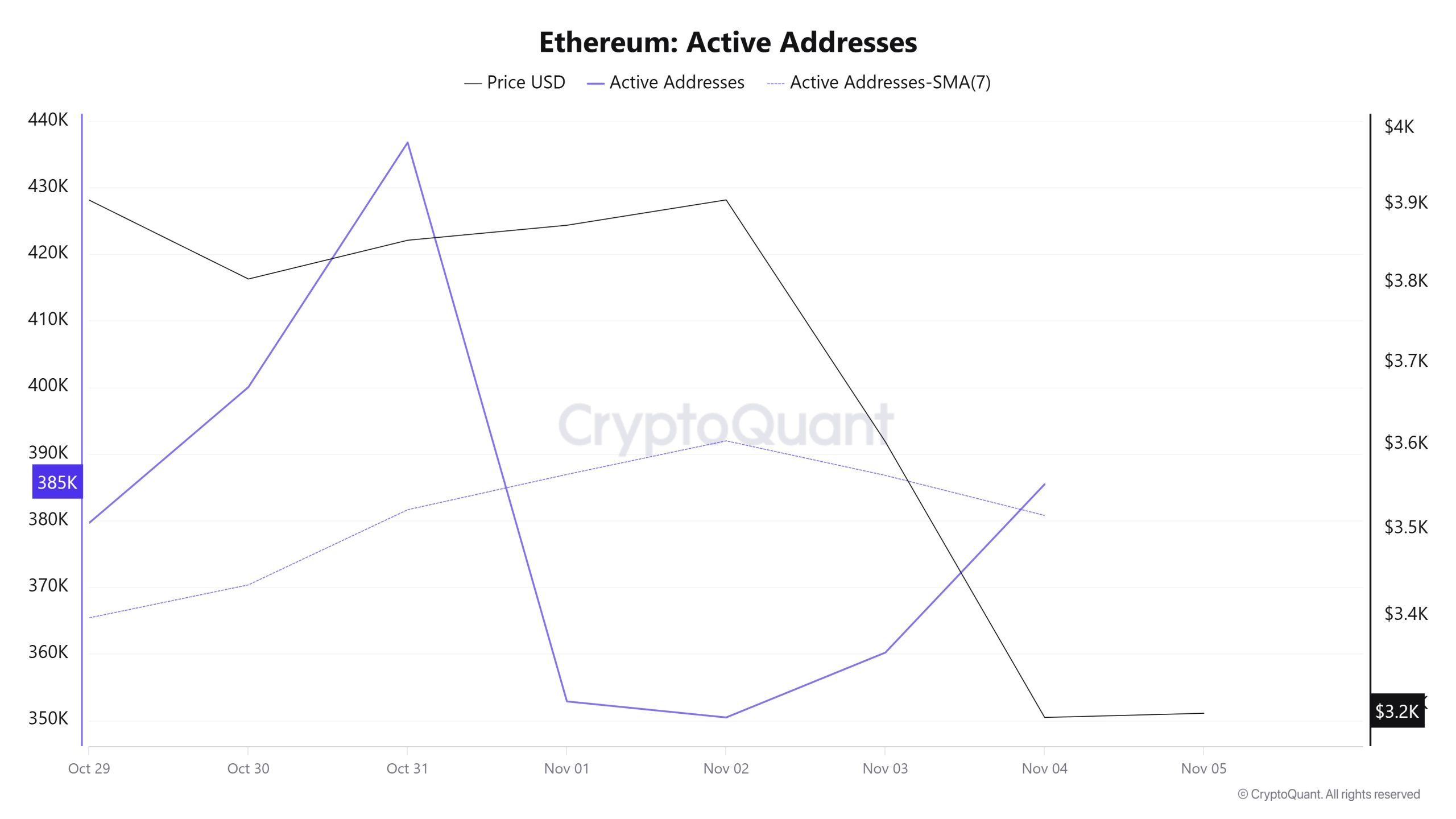 On October 29, while the ETH price was trading at $3,905, Staking Inflow was at 161,537. As of November 4, while the ETH price fell to $3,286, Staking Inflow dropped to 19,029, recording an 88.22% decrease.