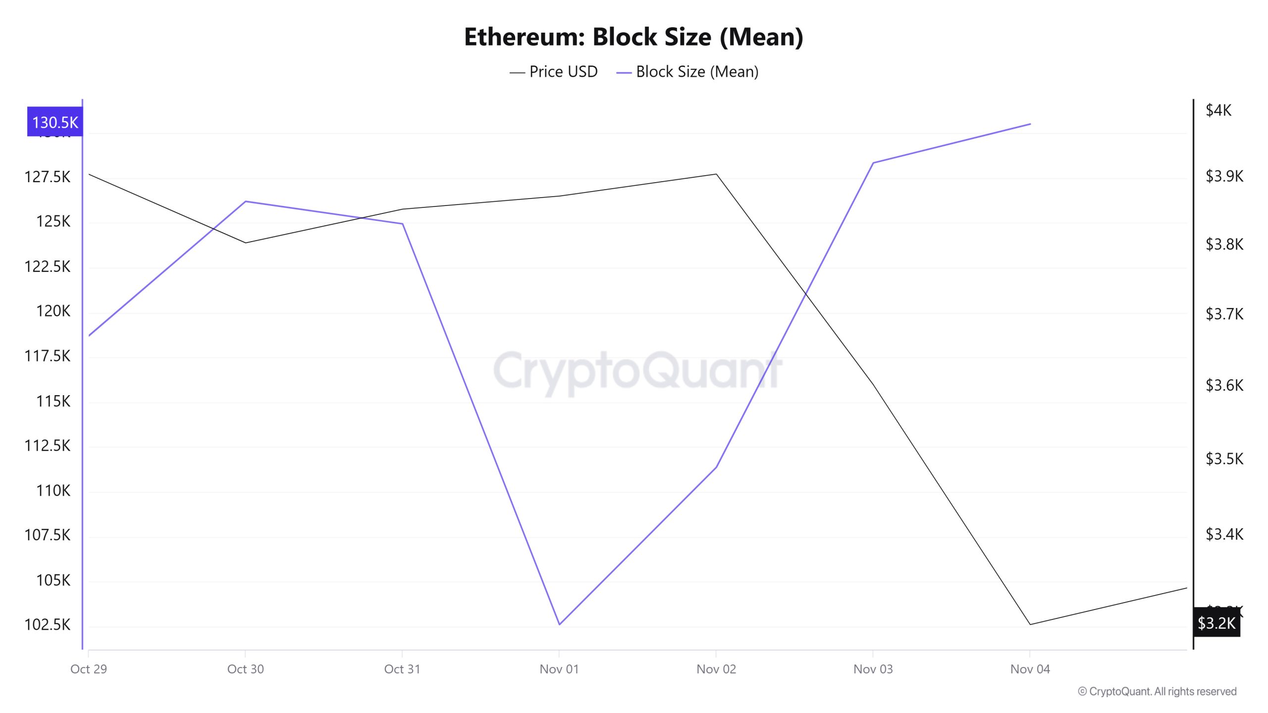 When examining Ethereum block size data between October 29 and November 4, an increase was observed throughout the week. While the average block size was measured at 118,705 bytes on October 29, this value rose to 130,515 bytes as of November 4.