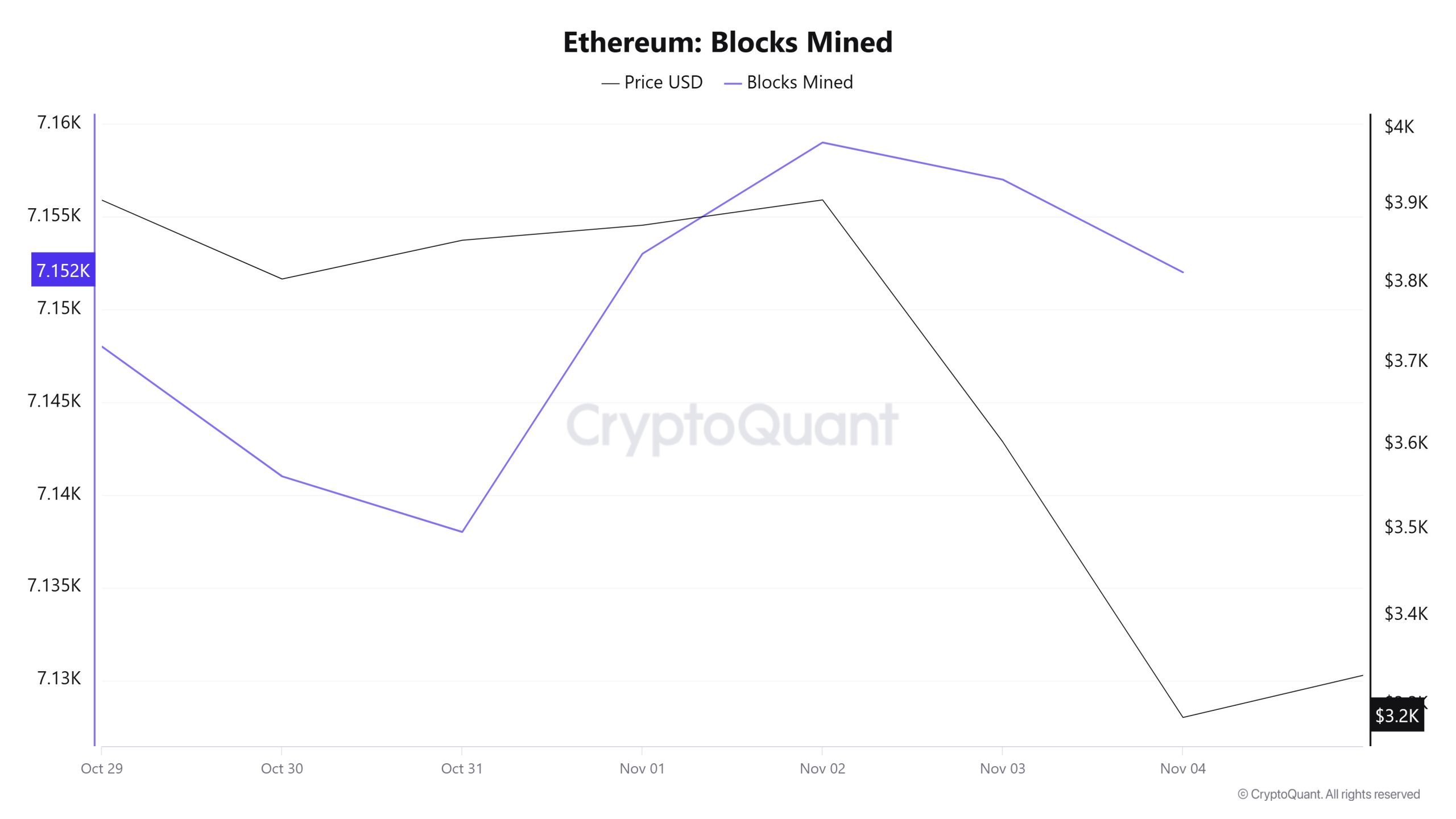 When examining Ethereum block production data between October 29 and November 4, there was a slight increase over the week. While 7,148 blocks were produced on October 29, this number rose to 7,152 as of November 4. A positive correlation was observed between the Ethereum price and the number of blocks produced throughout the week.