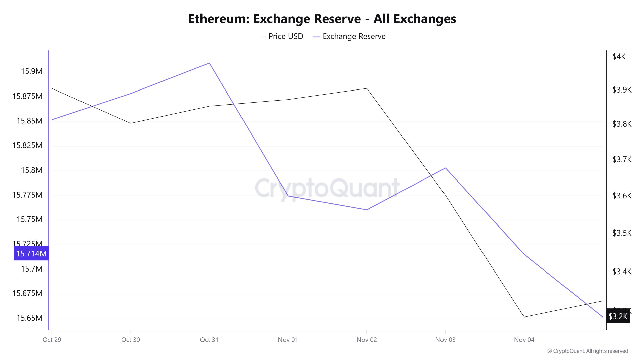 Although the metric showed an increase at the beginning of the 7-day period, it subsequently declined. After rising again in the middle of the period, the metric experienced a pullback towards the end. Starting at 0.628 at the beginning of the period, the ELR (Estimated Leverage Ratio) reached its lowest point on October 31, falling to 0.622. The metric then rose again, reaching its peak on November 3 at 0.671. At the time of writing, the metric stands at 0.643, indicating a slight decline in investor appetite. A higher ELR implies that participants are more willing to take on risk and typically indicates bullish conditions or expectations. It should be noted that these increases can also stem from a decline in reserves. Looking at Ethereum reserves, there were 15.85 million reserves at the beginning of the process, but this figure declined further during the rest of the process and currently stands at 15.64 million. At the same time, Ethereum’s Open Interest was $47.62 billion at the beginning of the process. As of now, volume has declined during the process, and the open interest value stands out at $38.19 billion. With all this data, the ELR metric experienced a balanced increase throughout the process. The asset’s price fluctuated between $3,900 and $3,110 with all this data. As of now, investors’ and traders’ risk appetite appears balanced. Consequently, the decrease in open interest volume and reserves throughout the process indicates that the slight increase in the ELR ratio is artificial.