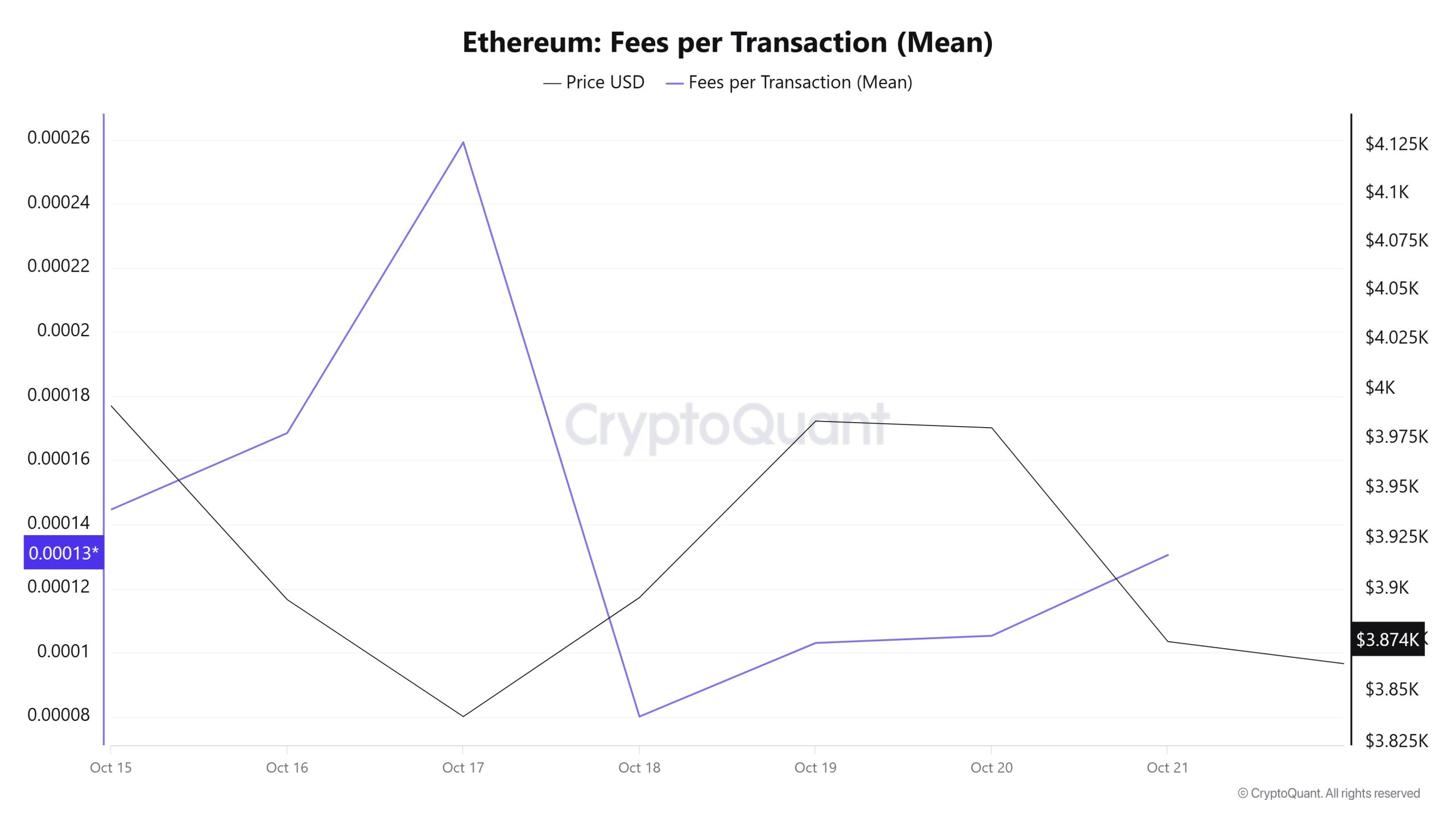 In the following days, the Ethereum Fees per Transaction (Mean) indicator resumed its upward trend, closing at 0.000130454111383375 on October 21, the last day of the week.