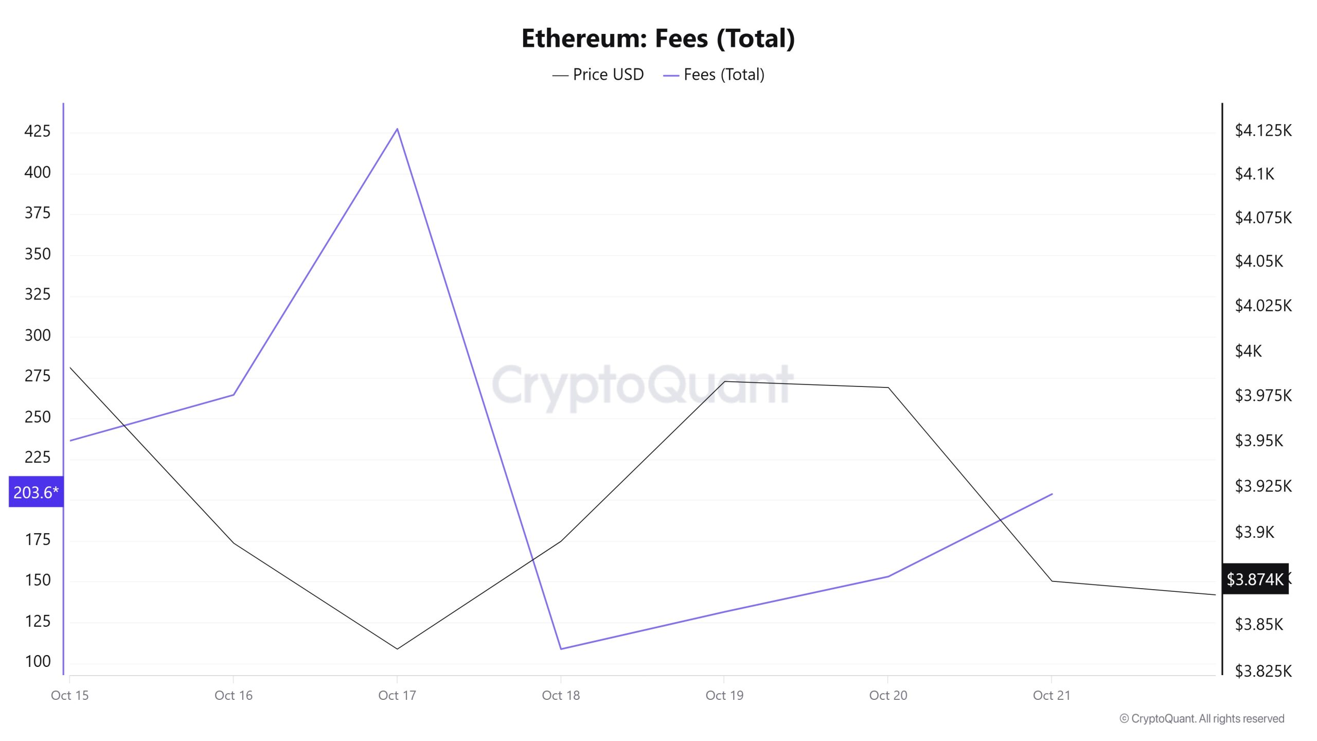In the following days, the Ethereum Fees (Total) indicator resumed its upward trend, closing at 203.65974052726943 on October 21, the last day of the week.