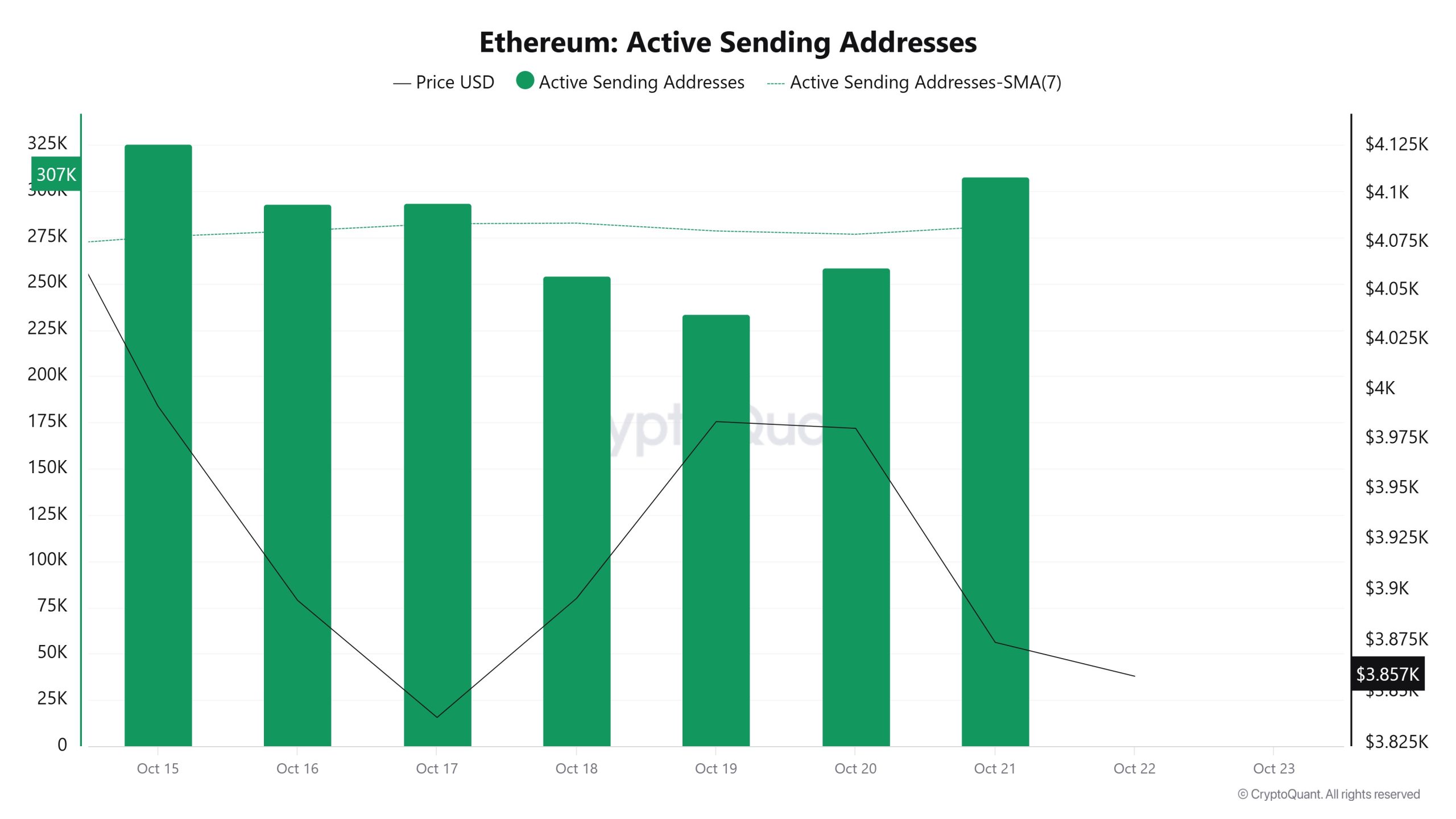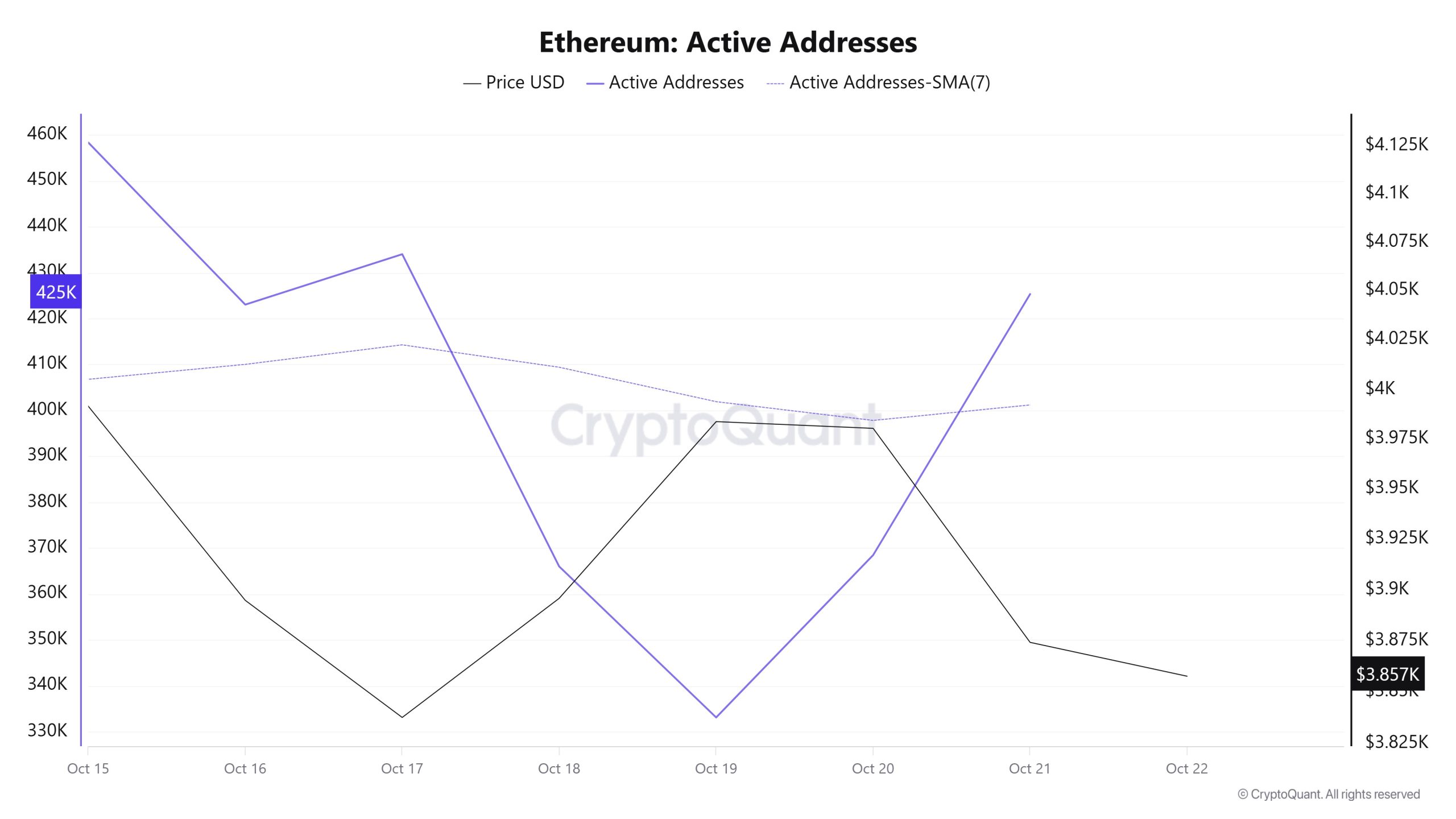 Between October 15 and October 22, a total of 458,318 active addresses were added to the Ethereum network. During this period, the Ethereum price fell from $3,991 to $3,849. On October 18, in particular, when the price hit the active address point, the number of active addresses declined, while the price rebounded. Looking at the 7-day simple moving average (SMA), the Ethereum price is generally trending upward.