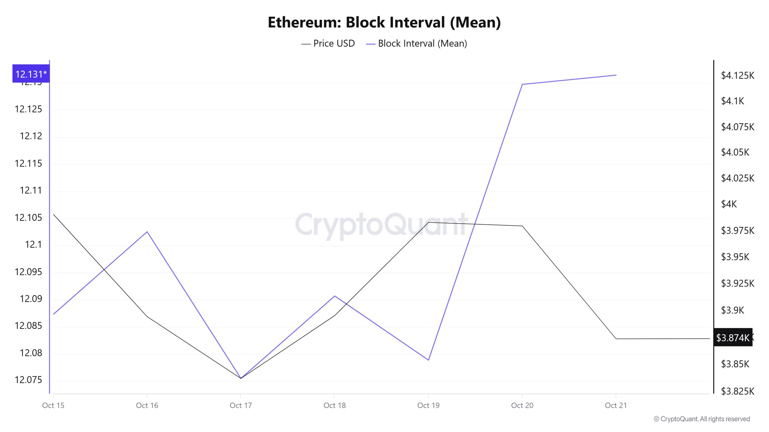 When examining the Ethereum block time between October 15 and 21, there was a slight increase over the week. While the average block time was recorded as 12.08 seconds on October 15, this time rose to 12.13 seconds as of October 21.