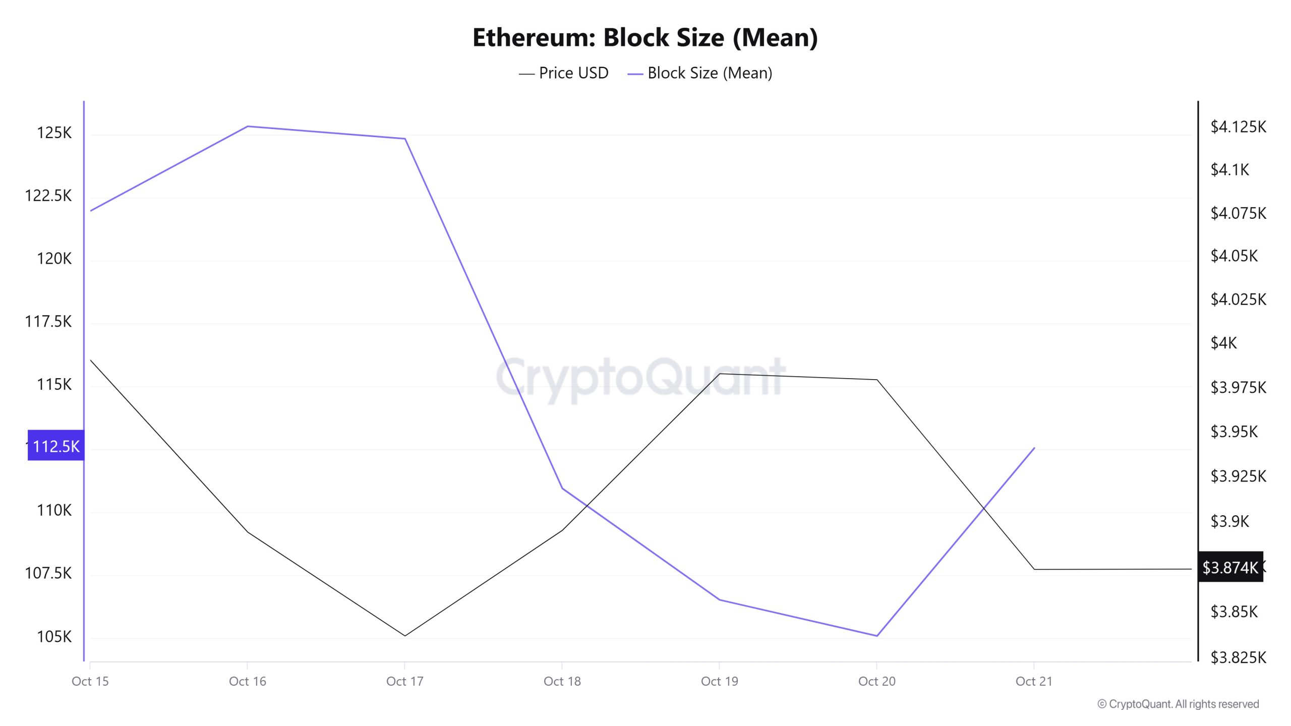 When examining Ethereum block size data between October 15 and 21, a decrease was observed throughout the week. While the average block size was measured at 121,957 bytes on October 15, this value declined to 112,547 bytes by October 21.