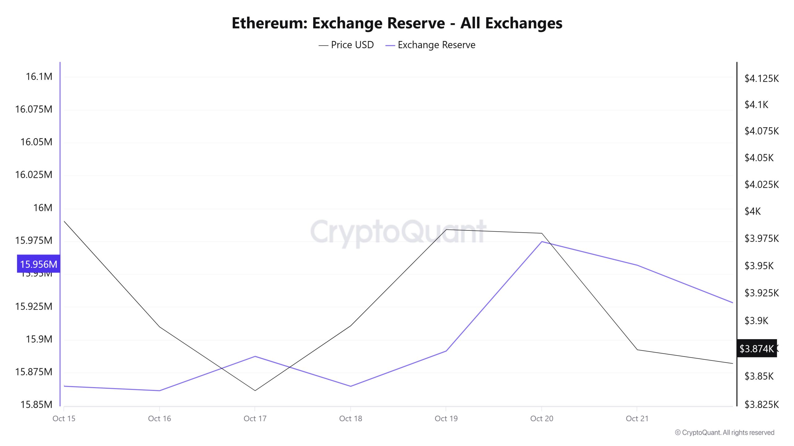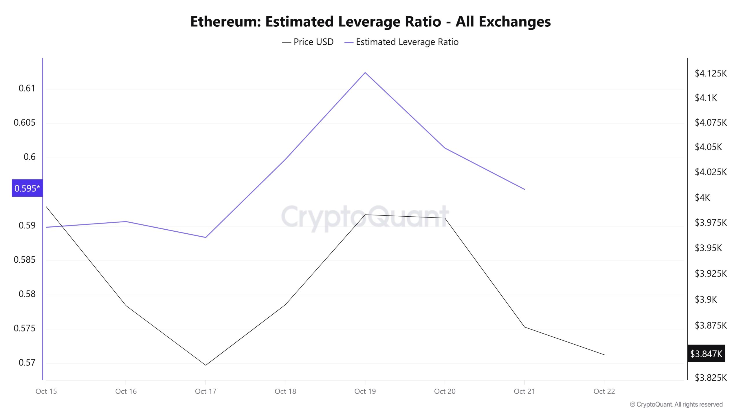 Over the 7-day period, the metric showed a slight increase from start to finish. Starting at 0.589, the ELR (Estimated Leverage Ratio) peaked at 0.612 on October 19. At the time of writing, the metric stands at 0.595, indicating a decline in investor appetite. A higher ELR means participants are more willing to take on risk and typically indicates bullish conditions or expectations. It should be noted that these increases may also stem from a decline in reserves. Looking at Ethereum reserves, there were 15.86 million reserves at the beginning of the process, and this figure rose slightly during the rest of the process and is currently at 15.92 million. At the same time, Ethereum’s Open Interest was $46.81 billion at the beginning of the process. As of now, volume has declined during the process, and the open interest value stands out at $42.63 billion. With all this data, the ELR metric rose until the middle of the process but lost value during the remainder of the period. The asset’s price fluctuated between $4,120 and $3,750 with all this data. As of now, investors’ and traders’ risk appetite appears balanced. The slight increase in the ELR ratio, explained by the decrease in open interest volume and the slight increase in reserves seen throughout the process, is evident. As a result, the increase in reserves and the decline in open interest caused a slight rise in the ELR metric. This shows us that the market has some appetite, but it cannot shake off its pessimism.