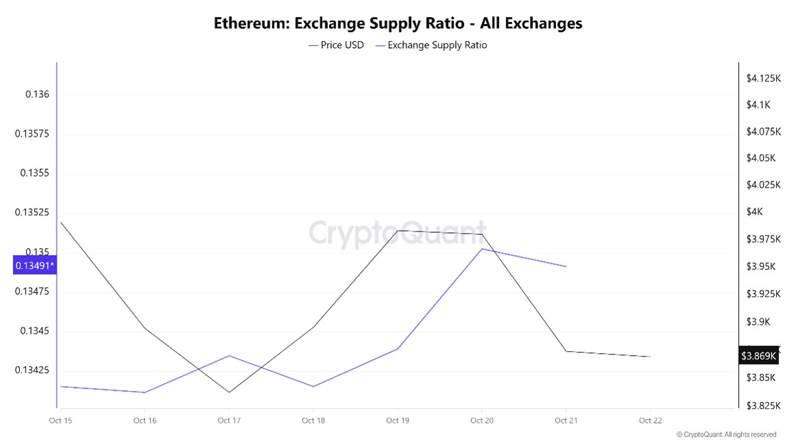 Between October 15 and 22, the Ethereum Exchange Supply Ratio fell from 0.13415242  to 0.13491291. During this period, the price of Ethereum fell from $3.3991 to $3.874. Particularly between October 15 and 22, at the point where the price and the Exchange Supply Ratio intersected, the Exchange Supply Ratio experienced a significant increase while the price continued to fall. This situation indicates that, despite the price decline, the amount of Ethereum supplied to exchanges has increased and that long-term investors have likely stopped holding their assets. Overall, a decline in the Ethereum price is evident.