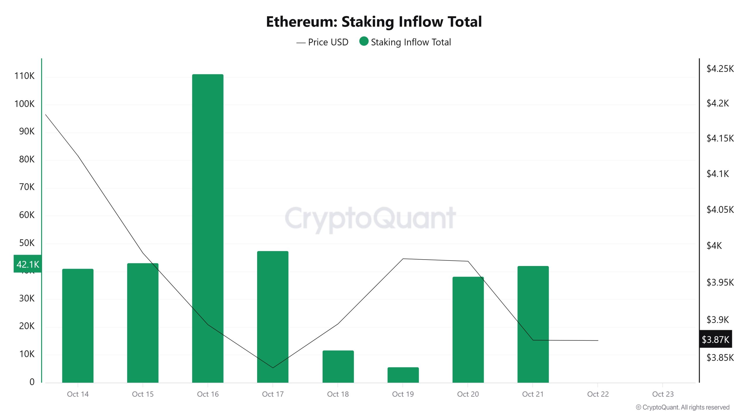 On October 15, while the ETH price was trading at $3,991, Staking Inflow stood at 43,085. As of October 21, the ETH price fell to $3,874, while Staking Inflow dropped to 42,197, recording a 2.06% decrease.