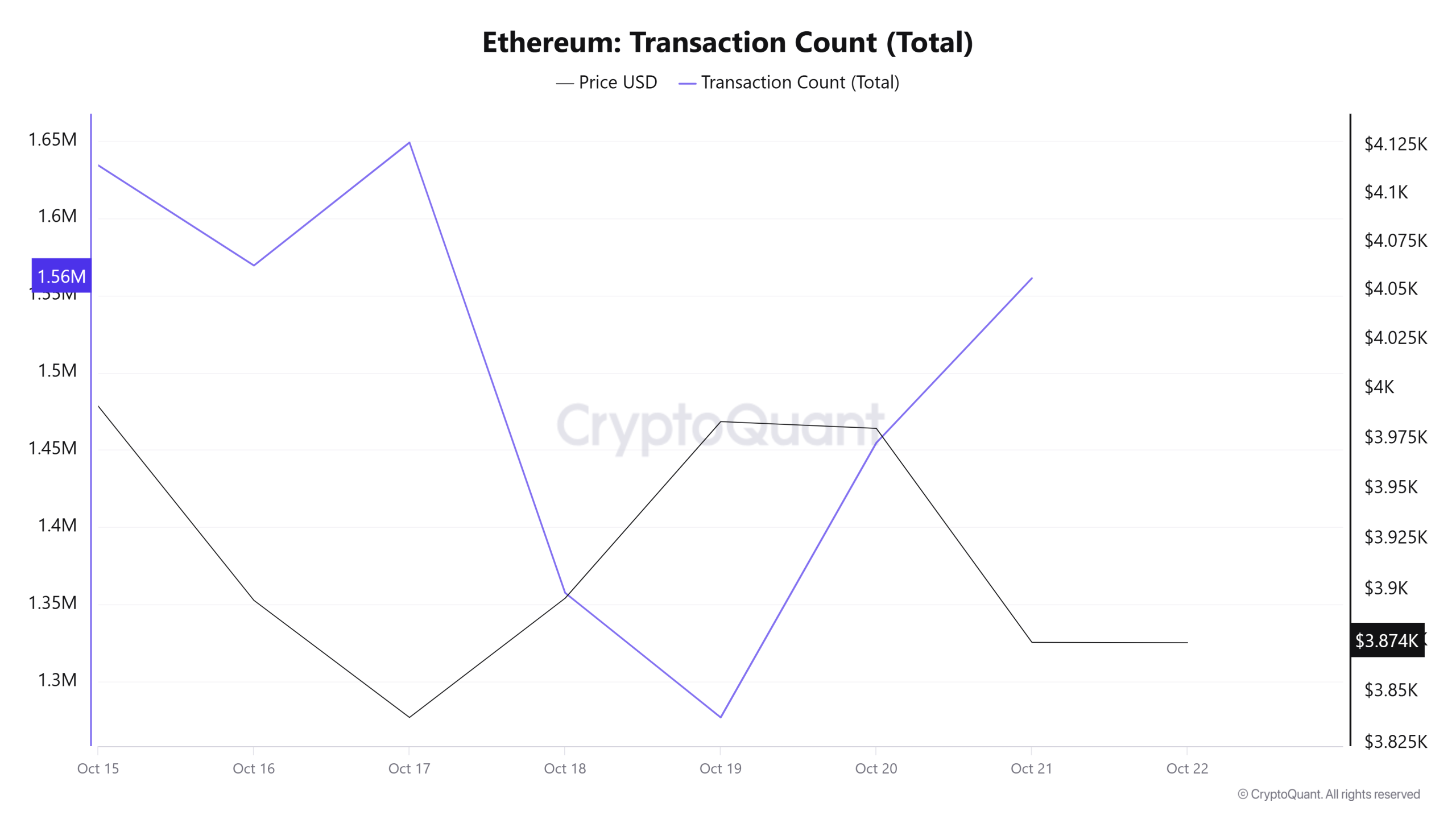 Last week, a total of 11,116,288 transactions were executed on the Ethereum network, while this week the number of transactions decreased by approximately 5.5% to 10,502,648. The highest weekly transaction count was recorded on October 17 at 1,649,015, while the lowest was on October 19 at 1,276,777. The correlation between transaction volume and price showed a negative trend. Therefore, based on current data, it appears more likely that transfers on the network are sales-heavy. On the other hand, the relatively low stability of network activity compared to the previous period points to a negative overall picture.