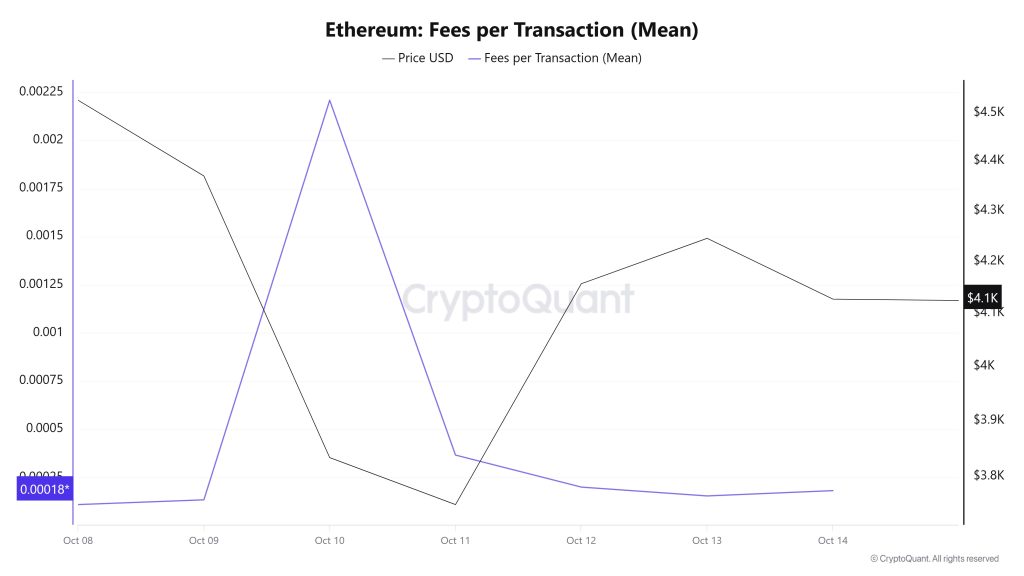 When examining the Ethereum Fees per Transaction (Mean) data between October 8 and 14, it is seen that on October 8, the first day of the week, the indicator stood at 0.000109868748783491.