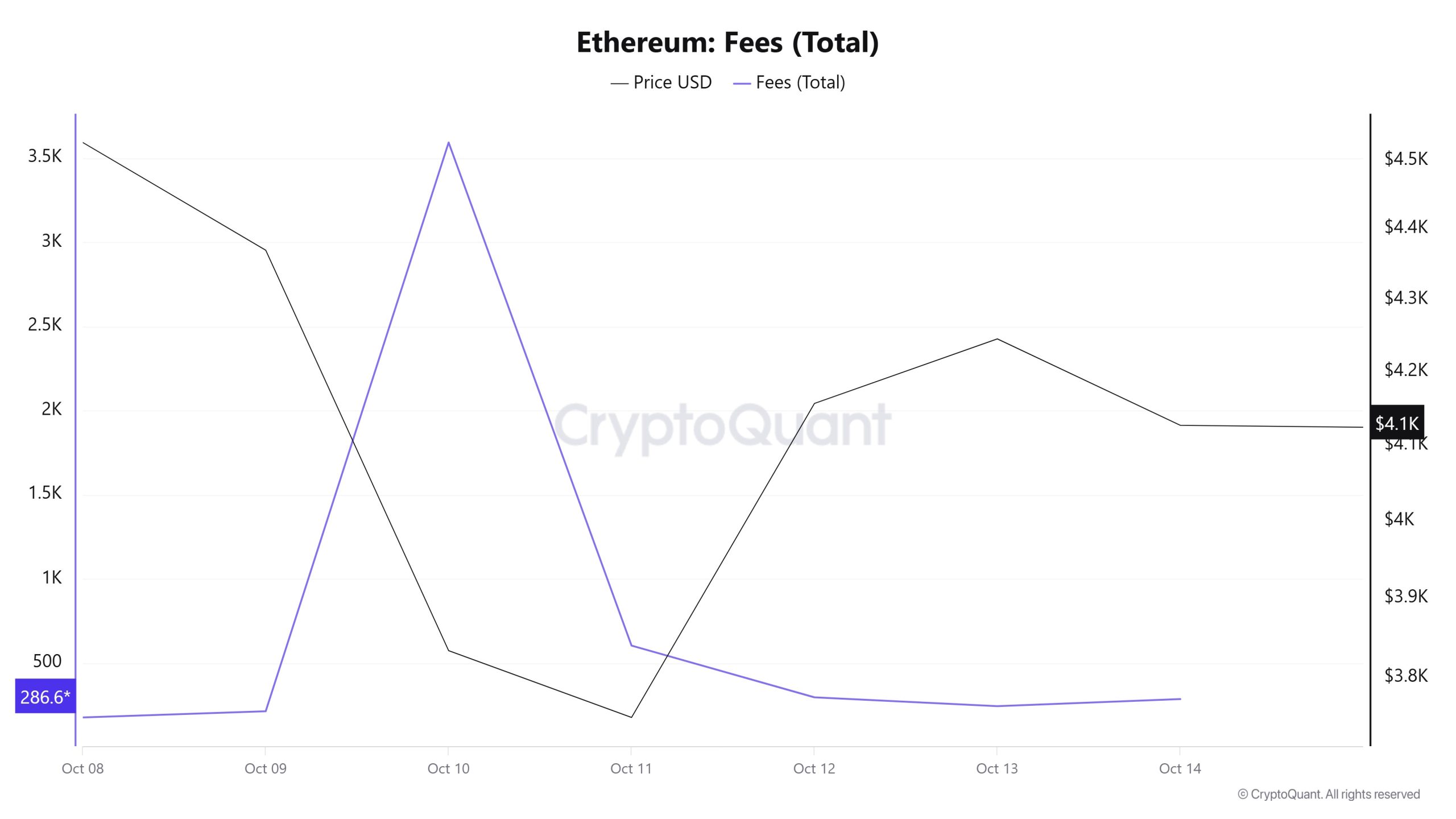 In the following days, the Ethereum Fees (Total) indicator resumed its downward trend and closed at 286.65839563974095 on October 14, the last day of the week.