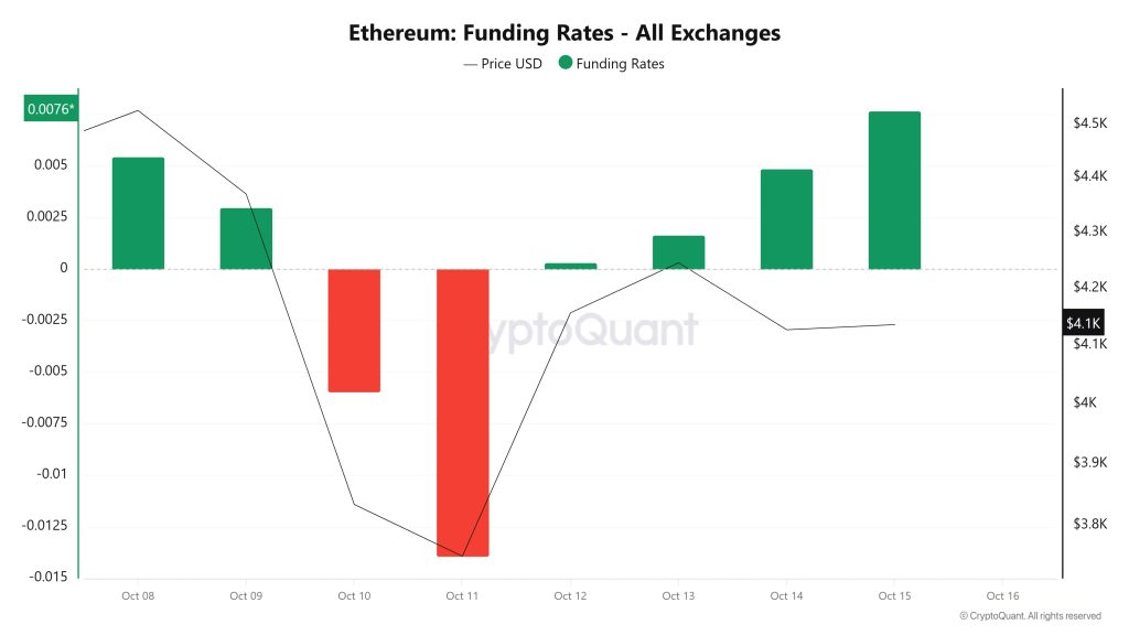 Ethereum’s funding rate data has shown a clear recovery trend in recent days. The rates, which turned negative on October 10 and 11, indicating that short positions had become dominant, have returned to positive territory since October 12. The rise in funding rate values, particularly on October 14 and 15, reveals that the market is once again favoring long positions. On the price side, ETH, which fell to around $3,400 with the decline on October 10, seems to have stabilized at the $4,100 level. Despite the increase in funding rates, the limited price response indicates that leveraged long positions have risen, but spot demand has not yet fully gained strength. The overall outlook suggests that investors maintain their bullish expectations in the short term, but the market is proceeding cautiously.