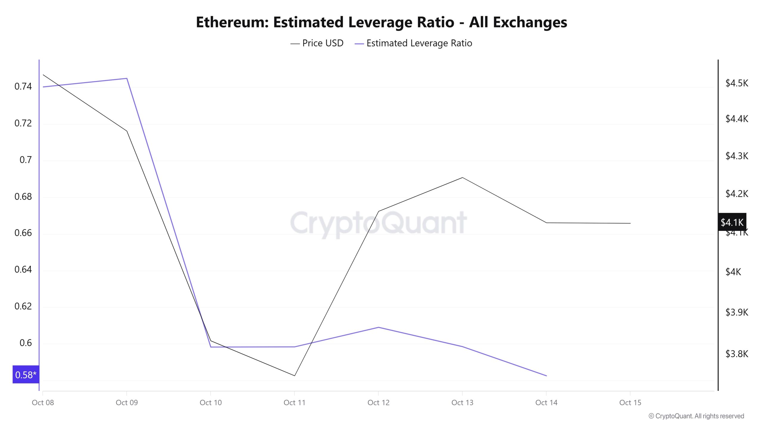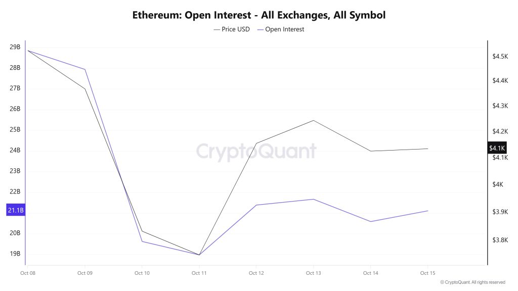Over the 7-day period, the metric showed a narrow decline from start to finish. Starting at 0.740 at the beginning of the process, the ELR (Estimated Leverage Ratio) rose to 0.744 on October 9, reaching the peak of the process. At the time of writing, it has fallen to 0.582, forming the lowest point of the process. A higher ELR means that participants are willing to take on more risk and usually indicates bullish conditions or expectations. It should be noted that these increases may also be due to a decrease in reserves. Looking at Ethereum reserves, there were 15.98 million reserves at the beginning of the process, but this figure declined slightly during the rest of the process and currently stands at 15.82 million. At the same time, Ethereum’s Open Interest was $60.36 billion at the beginning of the process. As of now, volume has declined during the process, and the open interest value stands out at $46.81 billion. With all this data, the ELR metric experienced a slight increase in the early stages of the process but steadily lost value during the remainder of the period. The asset’s price fluctuated between $4,530 and $3,400 with all this data. As of now, investors’ and traders’ risk appetite has decreased significantly. The decrease in open interest volume seen throughout the process, accompanied by a decrease in reserves, indicates that the decline in the ELR ratio reflects a significant decrease in risk appetite among investors. As a result, the withdrawal of reserves and the decline in open interest have caused a decline in the ELR metric. This