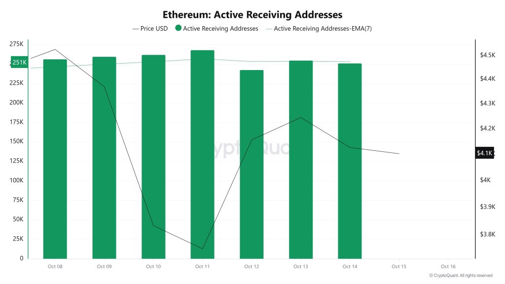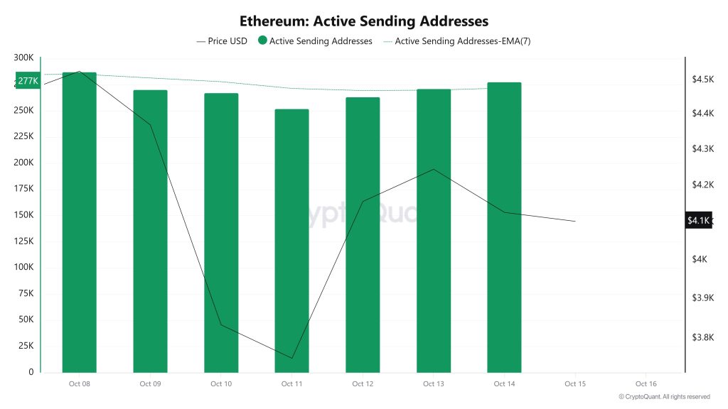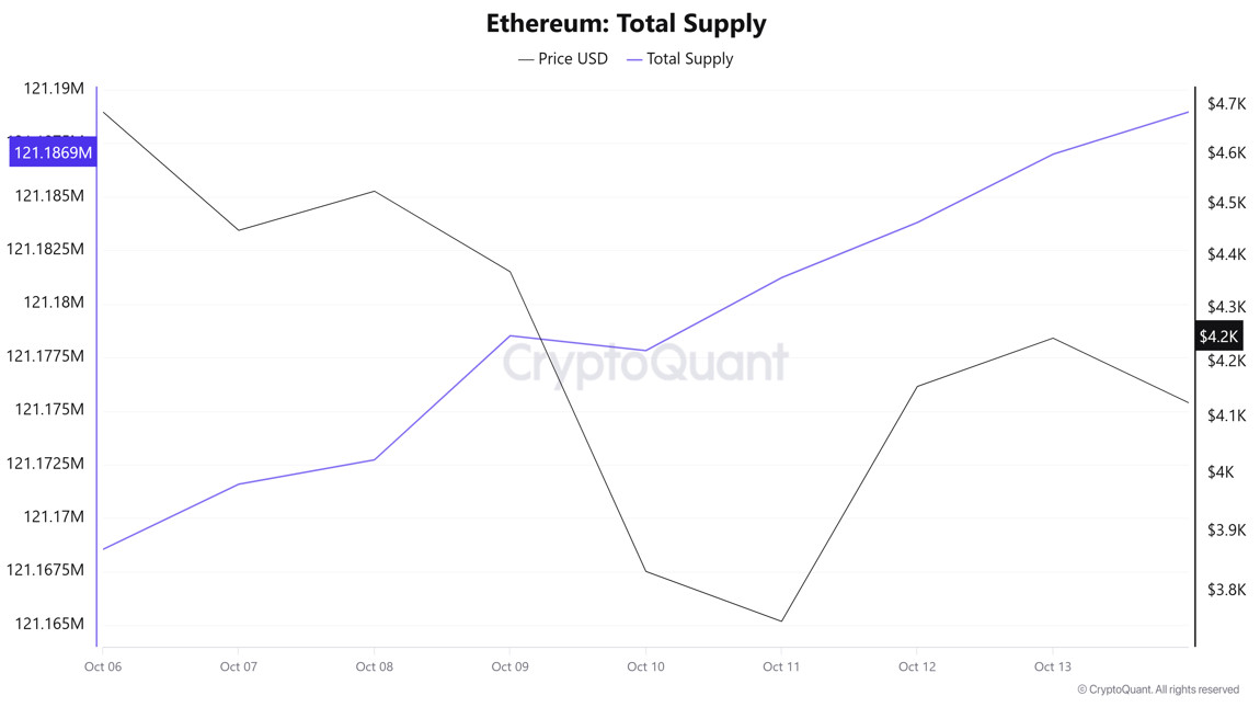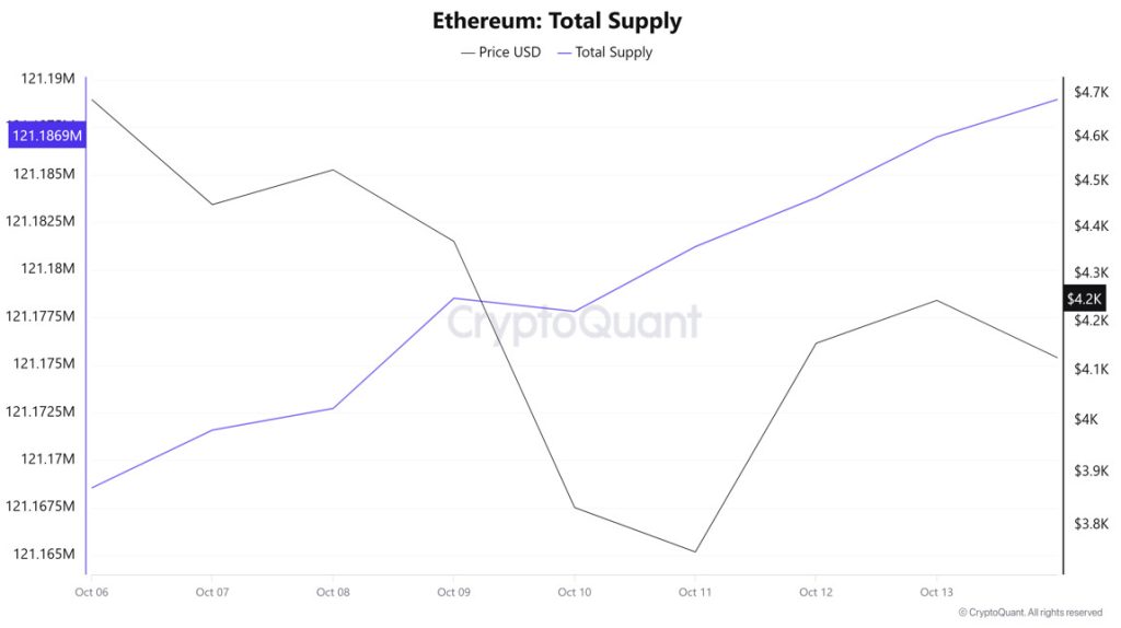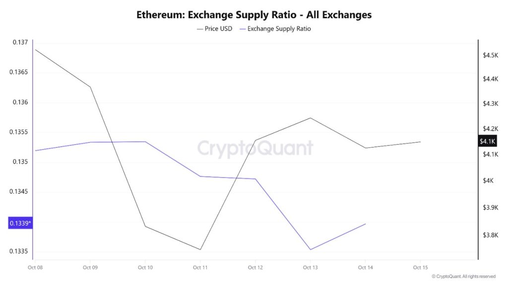 Between October 8 and 15, following Trump’s statements regarding China, crypto markets began to decline, causing the Ethereum Exchange Supply Ratio to drop from 0.13519414 to 0.13396711. During this period, the price of Ethereum fell from $4,369 to $4,126. This week in particular, the positive correlation between price and Exchange Supply Ratio indicates that the amount of Ethereum supplied to exchanges decreased alongside the price decline, suggesting that long-term investors may have stopped holding their assets. Overall, uncertainty prevails in the price of Ethereum.