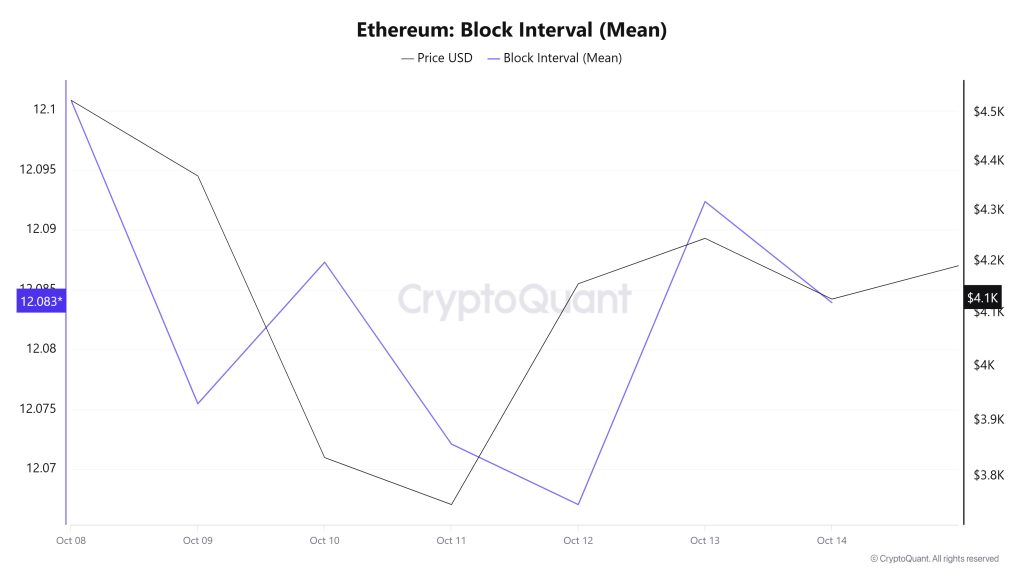 When examining the Ethereum block time between October 8 and 14, a slight decrease occurred throughout the week. While the average block time was recorded as 12.10 seconds on October 8, this time decreased to 12.08 seconds as of October 14.