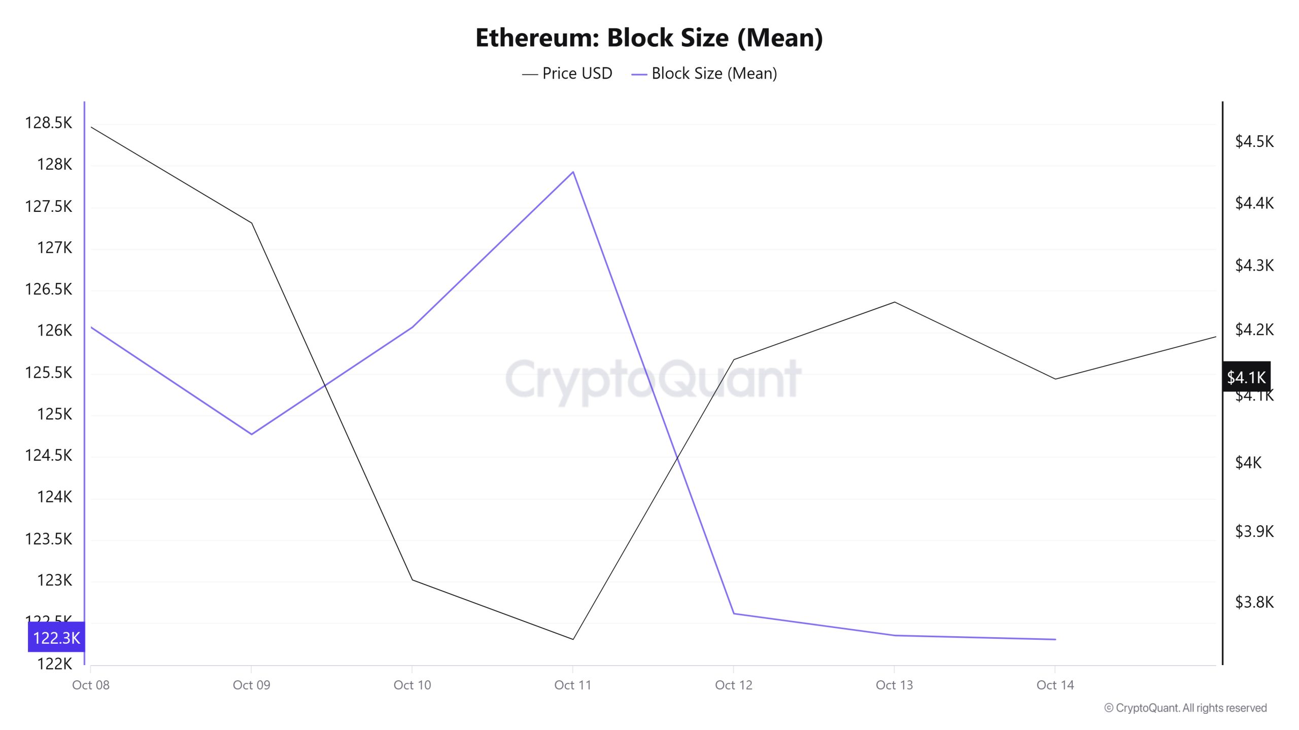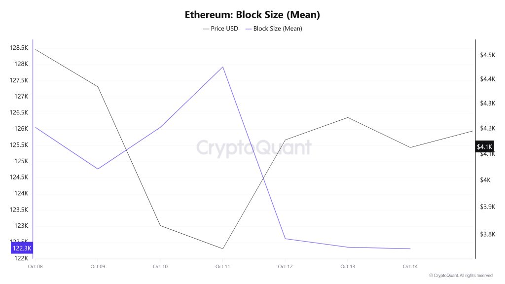 When examining Ethereum block size data between October 8 and 14, a decrease was observed throughout the week. While the average block size was measured at 126,059 bytes on October 8, this value declined to 122,305 bytes by October 14.