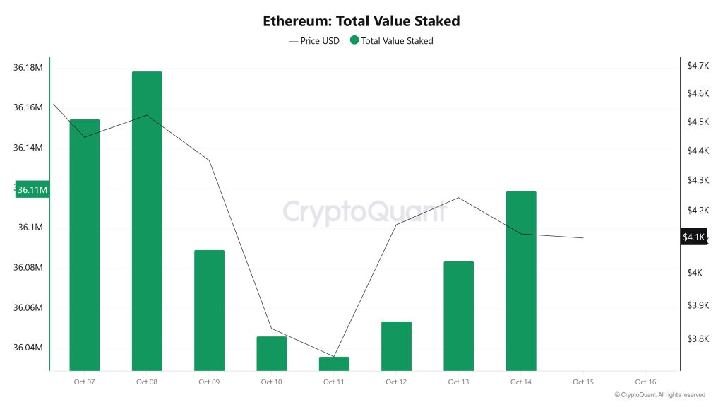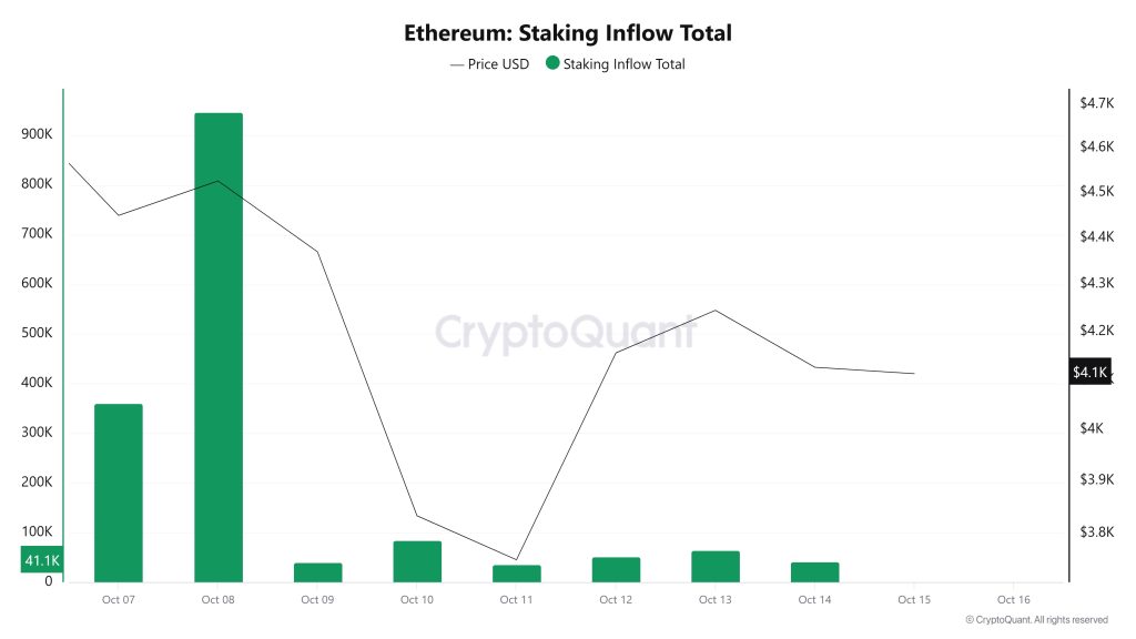 On October 8, when the ETH price was $4,526, Staking Inflow was at 946,848. As of October 14, the ETH price fell to $4,126, while Staking Inflow dropped to 41,143, recording a 95.65% decrease.