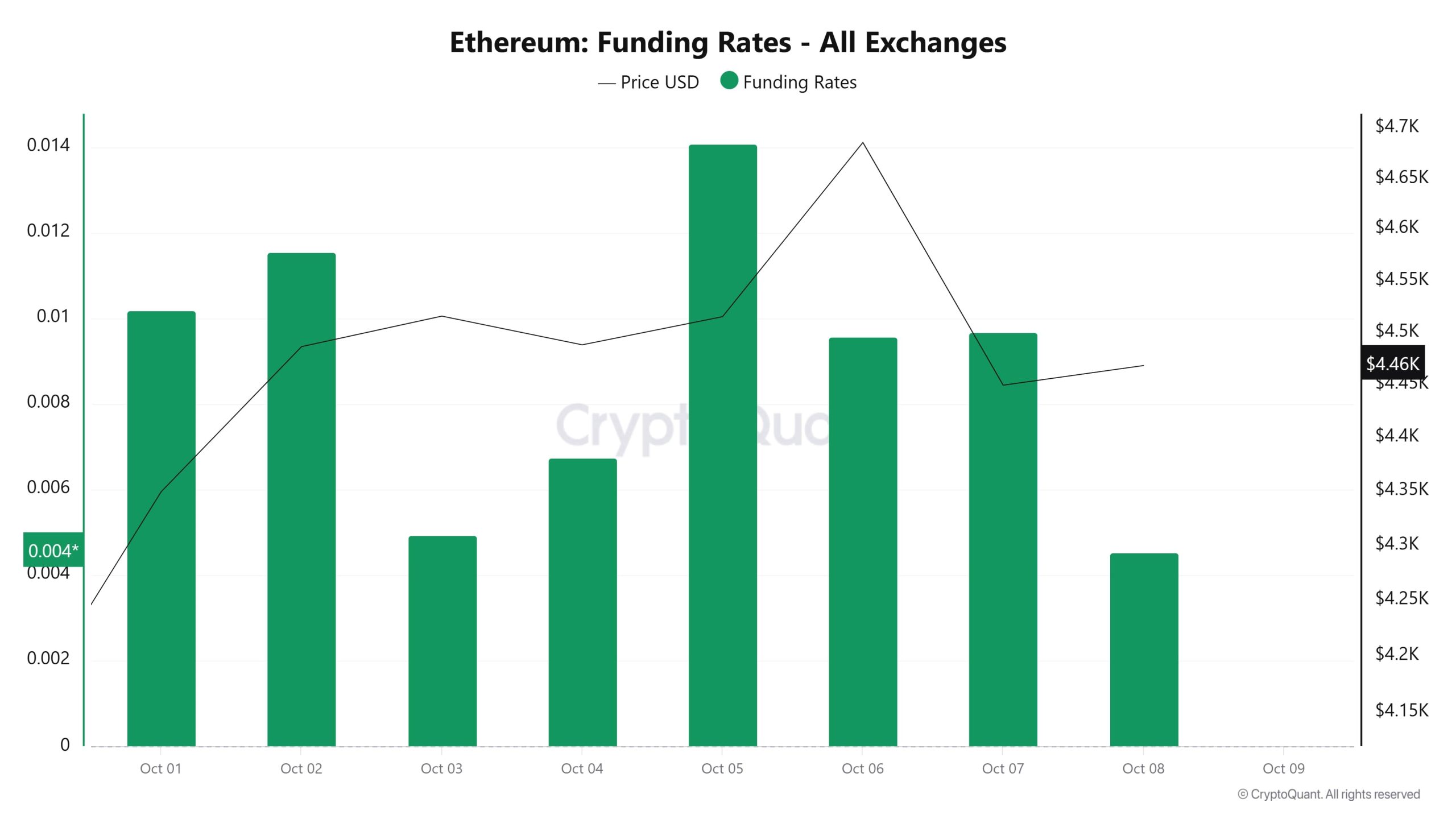 Funding ratios were generally in positive territory, indicating that the market was mainly driven by long positions during this period. On October 5, the ratio hit a weekly high of 0.014, indicating that there was a significant increase in leveraged buy trades and investors’ bullish expectations strengthened. However, after this rise, both funding rates and price action weakened as of October 6. The decline in the ETH price from $4,650 to $4,460 suggests that the market has moved from excessive optimism to a short-term cooling process and some of the leveraged positions have been closed.