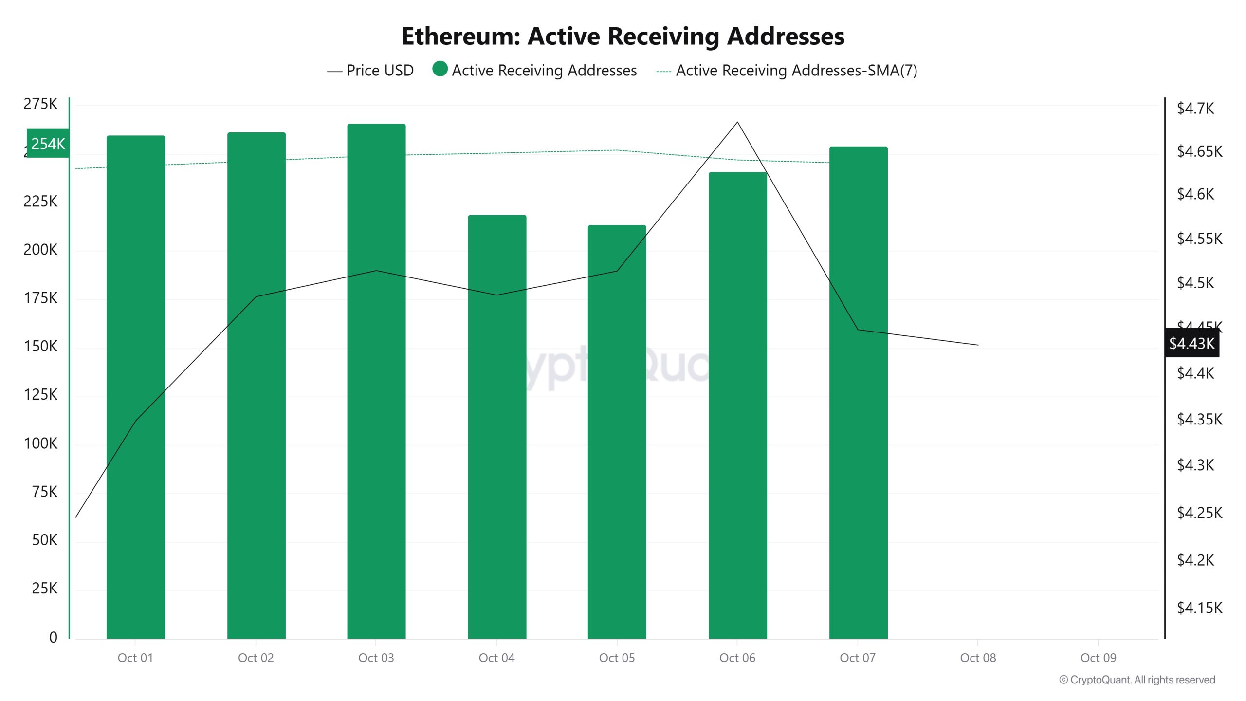 Between October 1 and October 8, there was no significant increase in active buying addresses and the price consolidated horizontally. On the day when the price reached its highest level, active receiving addresses reached 265,867, indicating that purchases are increasing.