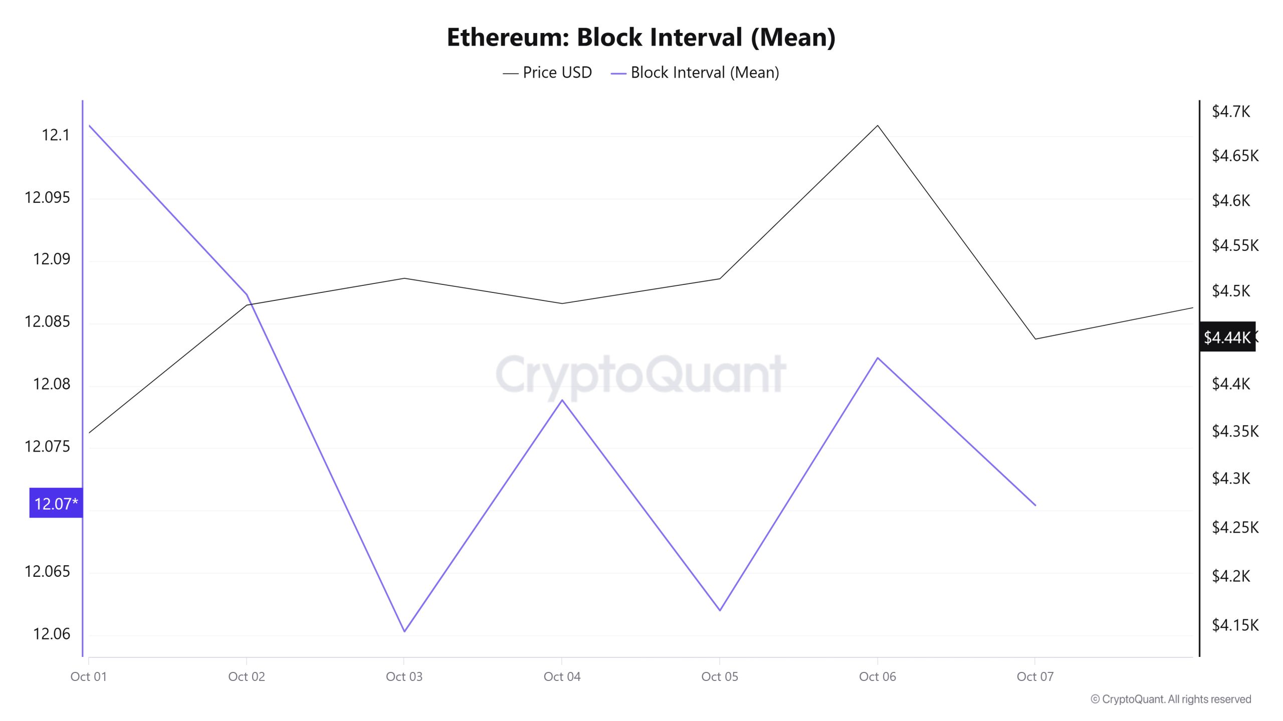 Between October 01 – 07, Ethereum block time decreased slightly throughout the week. On October 01, the average block duration was recorded as 12.10 seconds, while it decreased to 12.07 seconds as of October 07.