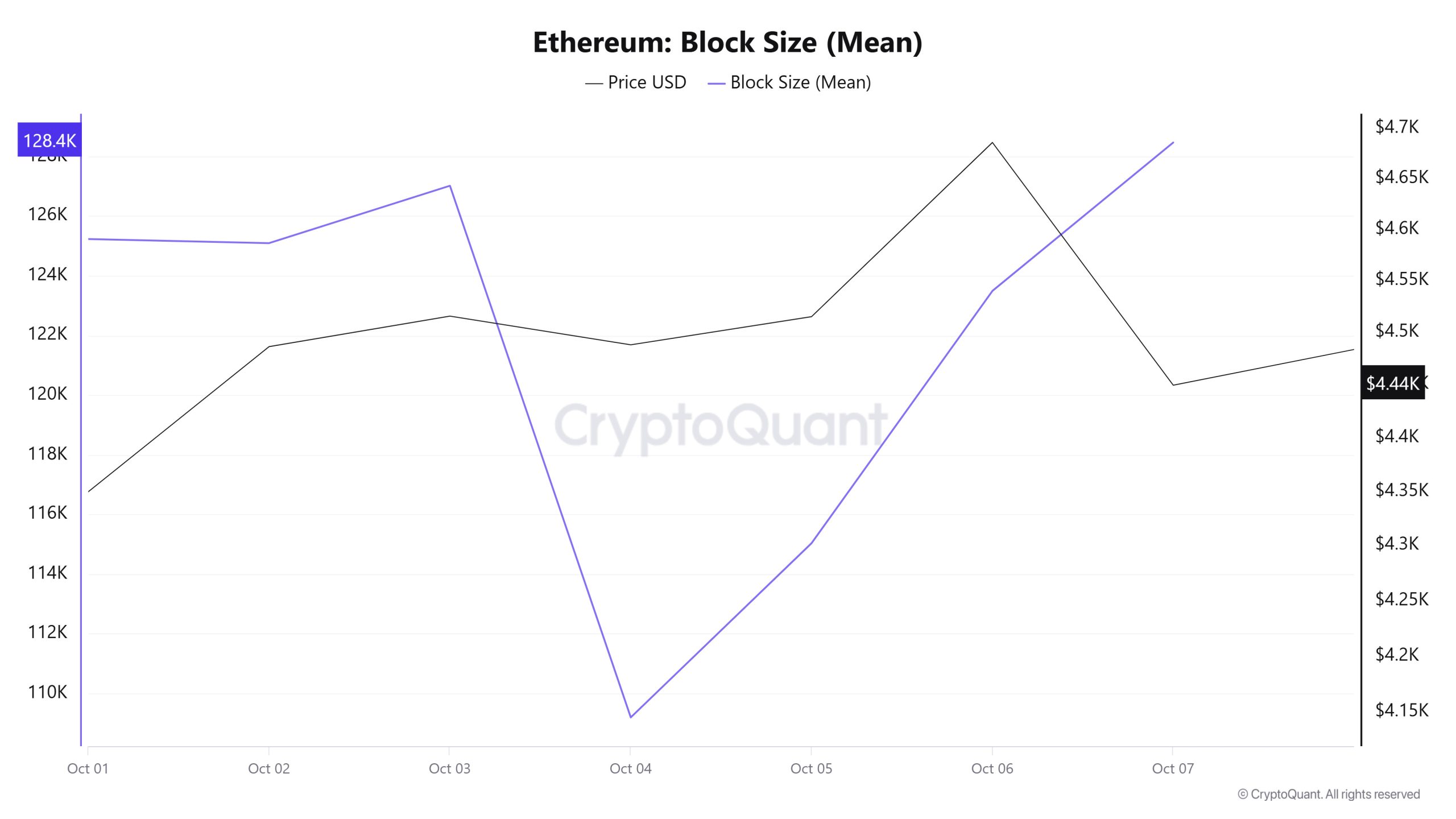 Between October 01 – 07, Ethereum block size data shows that there was an increase throughout the week. On October 01, the average block size was 125,231 bytes, while this value increased to 128,466 bytes as of October 07.