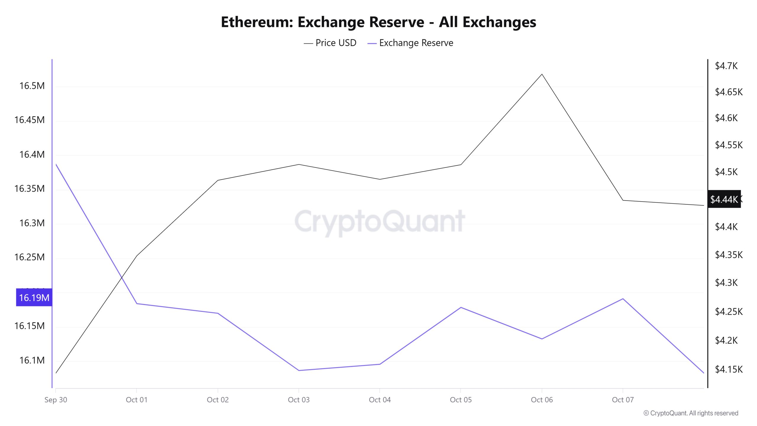 Between October 01-07, 2025, Ethereum reserves on exchanges decreased from 16,386,852 ETH to 16,190,977 ETH, with a total net outflow of 195,875 ETH. In this process, reserves decreased by approximately 1.20%. In the same period, the ETH price rose from $4,146 to $4,449, gaining about 7.32%. The decline in reserves while the price increased suggests that investors continued to withdraw their ETH from exchanges despite the rise, selling pressure remained low and the supply contraction supported the price. The upward trend in the ETH price may continue if investors maintain their long-term holding trend.