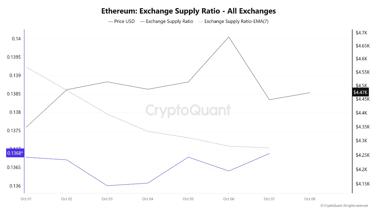Between October 1 and October 7, after the US government shutdown in crypto assets   markets started to rise, Ethereum Exchange Supply Ratio increased from 0.1367188 to 0.13704186. During this period, the Ethereum price dropped from $4,486  to $4,449. The negative correlation between the price and the Exchange Supply Ratio, especially this week, shows that despite the price decline, the amount of Ethereum supplied to exchanges has increased, possibly indicating that long-term investors continue to hold their assets. It is seen that the expectation of a general decline in the Ethereum price is dominant.