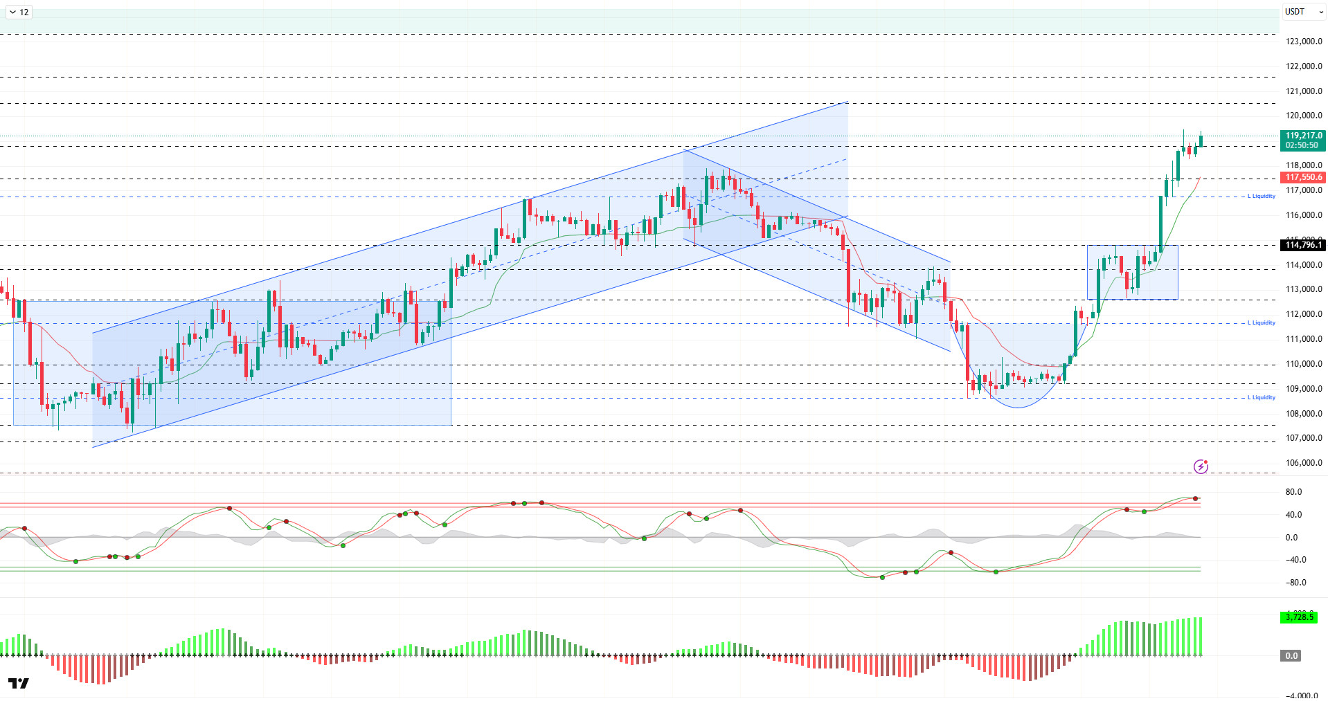 Looking at the technical picture, BTC continues to carry its upward momentum captured with the cup formation. The “W” formation in the broader time frame is completing at the 123,400 level. BTC, which was moving at the 118,500 level in the previous analysis, regained momentum and reached the 119,400 level.