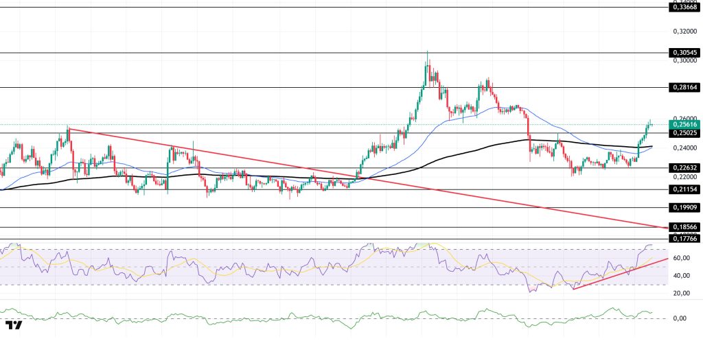 On the 4-hour chart, the 50 EMA (Exponential Moving Average – Blue Line) remained below the 200 EMA (Black Line). This indicates a downward trend in the medium term. The price being above both moving averages indicates a short-term upward trend. The Chaikin Money Flow (CMF-20) managed to stay in positive territory. Additionally, balanced cash inflows could keep the CMF in positive territory. The Relative Strength Index (RSI-14) gained upward momentum from the rising direct support that began on September 25 and rose to the overbought level. This could bring profit-taking. In the event of potential increases driven by political developments, macroeconomic data, or positive news flow within the DOGE ecosystem, the $0.28164 level stands out as a strong resistance zone. Conversely, in the event of negative news flow, the $0.22632 level could be triggered. A decline to these levels could increase momentum and potentially initiate a new upward wave.