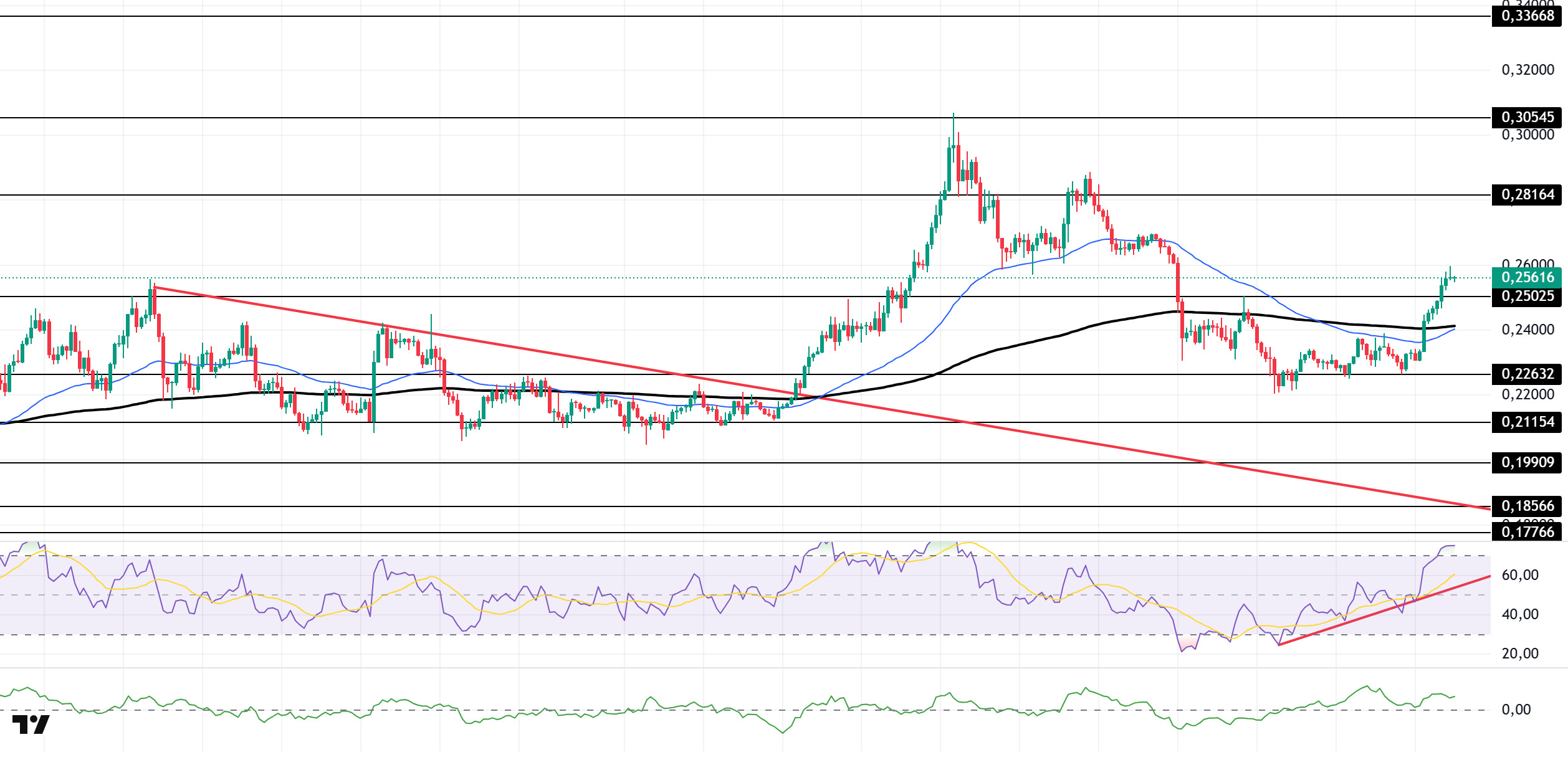 In light of all these indicators, TRX may rise slightly in the second half of the day and move towards the upper band of the bearish channel. In such a case, it may test the 0.3465 resistance level. With a candle close above the 0.3465 resistance level, the rise may continue and it may test the 0.3550 resistance level. If the 0.3465 resistance level is not closed with a candle, money inflows may weaken as the CMF also moves into negative territory, and the price may test the 0.3395 and 0.3340 support levels in succession after a possible decline.