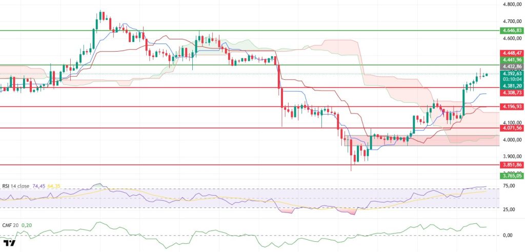 Closings above the Kumo cloud in the Ichimoku indicator clearly show that the trend has turned positive. Remaining above the Tenkan and Kijun levels is also an important signal indicating that buyers maintain their technical advantage. This structure stands out as one of the strong technical indicators supporting the short-term bullish scenario.