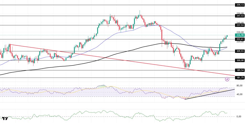 The SOL price remained flat during the day. The asset continues to trade in the upper region of the descending trend that began on August 29. The price, which broke above the 50 EMA (Blue Line) moving average and the 200 EMA (Black Line) moving average with a strong bullish candle, continues to trade above the strong resistance level of $222.61, maintaining its momentum. If the upward trend continues, it could test the $237.53 level. In case of pullbacks, the $209.93 level can be monitored.