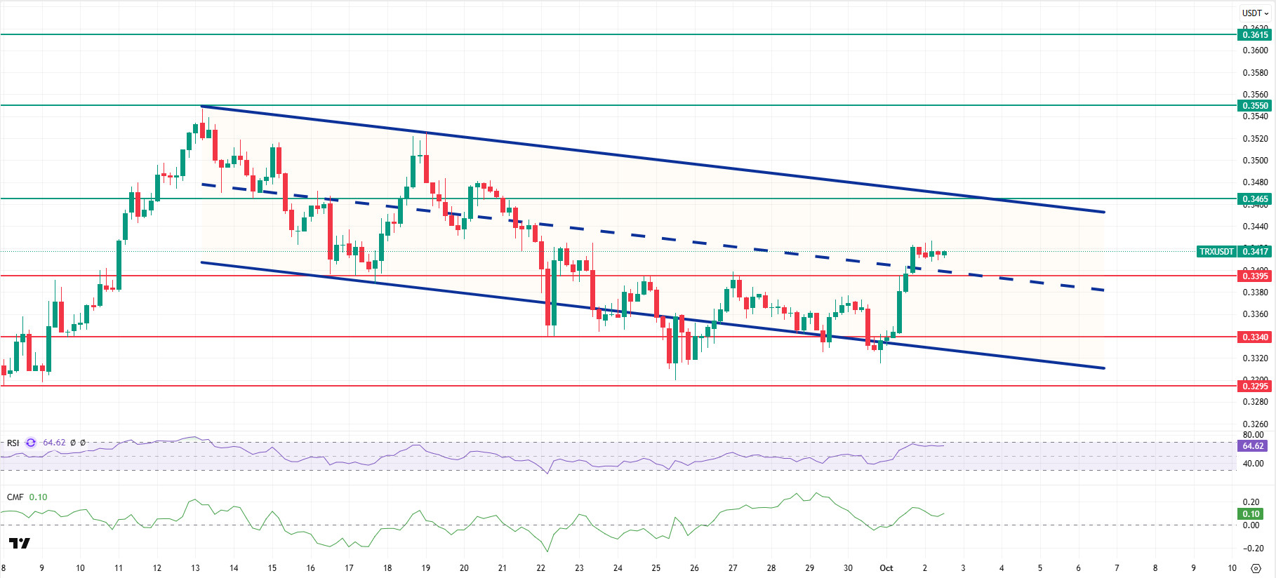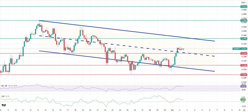 As mentioned in this morning’s analysis, TRX managed to stay above the 0.3395 support level after the decline and continues to move within the bearish channel, currently trading at 0.3417. Currently in the middle of the bearish channel, TRX is trading very close to the 0.3395 support level on the 4-hour chart. The Relative Strength Index (RSI) value is seen to be close to the overbought zone at 64. In addition, the Chaikin Money Flow (CMF) indicator continues to remain above the zero level at a value of 0.10, indicating that money inflows are continuing. The CMF remaining in positive territory can be considered an indicator that the price may experience an increase.