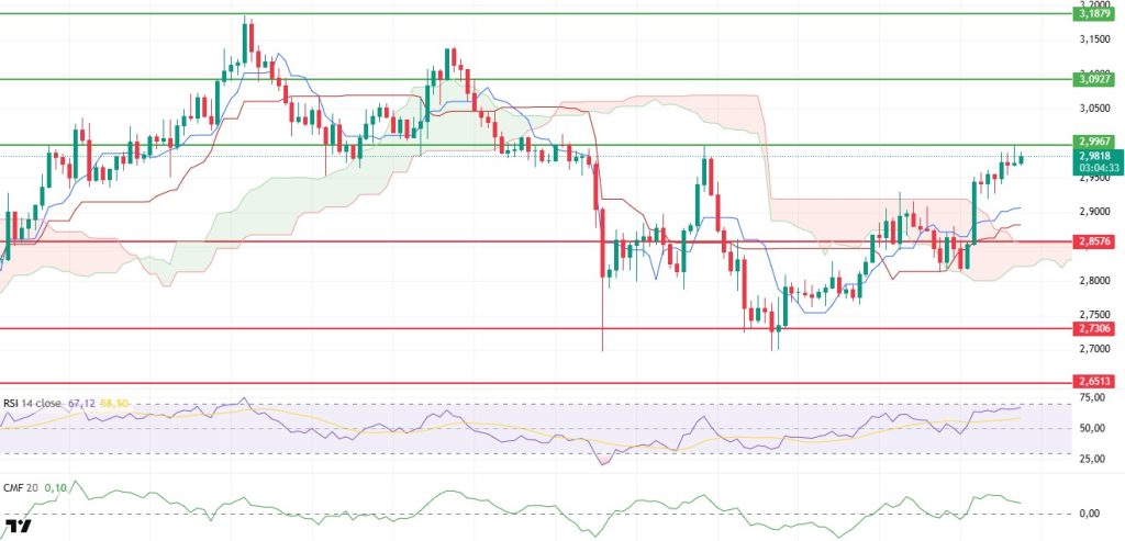 In the coming period, the $2.99 level should be closely monitored as a critical resistance. If this level is broken, the price is expected to rise rapidly towards $3.09, and buyers’ momentum may strengthen further. However, if this resistance cannot be broken, the price is likely to experience a short-term consolidation process in the $2.93–$2.90 range. On the other hand, the $2.8576 level is a strong support. Losing this level could increase selling pressure and cause the price to retreat back towards the $2.73 level.