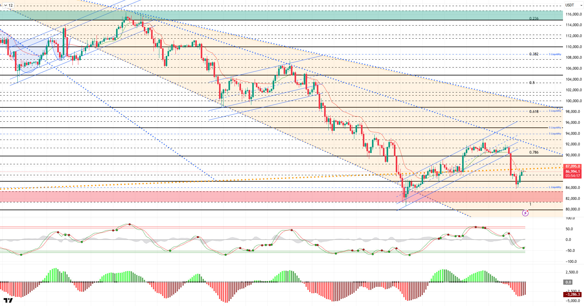 From a technical perspective, BTC briefly fell below 85,000 in the previous analysis, testing the 83,900 level. Here, the price, which carried out a liquidity purchase, quickly reversed its direction upward and rose above the 85,000 reference level. The price then carried its upward momentum into the third candle, once again touching the major uptrend and continuing to push towards the 87,000 level at the time of writing.