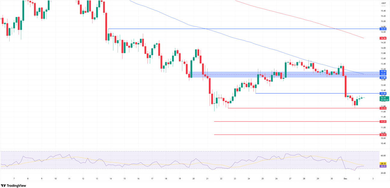 LINK, which entered a short-term upward trend with a strong reaction from the $11 level on November 21, managed to maintain its momentum for a while by breaking above the $13 threshold on November 27. However, following the horizontal squeeze at the $13 band, the price faced strong selling pressure, losing the support line at the $12.28 level and breaking downwards.