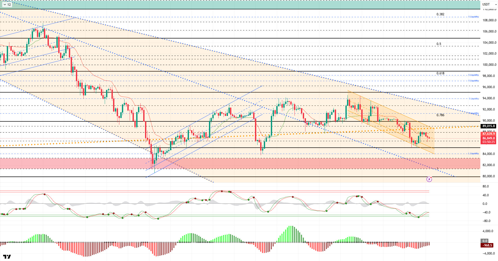 In summary, while the US economy remains stuck between labor and inflation, Treasury Secretary Bessent indicated that the new Fed chair could be announced in January. It is understood that Trump is actively evaluating the selection process for the new Fed chair, with the names of Hassett, Warsh, and Waller being discussed. On the Asian front, Japan is moving towards interest rate hikes, while China has increased its money supply in response to deteriorating economic data. Technically, BTC, which retreated to the 80,500 level following the downtrend that formed after the ATH, rebounded strongly from this region. Subsequently, the price settled above the 90,000 level and entered a consolidation phase for a while, then retreated again, falling below the major uptrend line and testing the 85,000 level. When examining liquidity data, it is seen that areas with concentrated short-term trading are being targeted, while long-term sell orders have not yet been tested. After this stage, the 85,000 level has become a critical point for the price to maintain its momentum. Closes and pricing above this level are an important indicator for regaining momentum. In this context, 88,000 stands out as the next target area, and if it is passed, liquidity areas will be monitored again. In the event of a possible selling pressure, the 85,000 level will be monitored as the last obstacle to the price forming a double bottom at the 80,000 level.