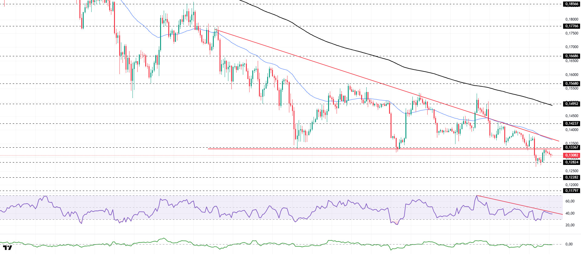 The DOGE price experienced a slight pullback. The asset experienced a pullback by breaking below the base level of the descending triangle formation that began on November 13.  Currently showing a slight increase, the price tested the base level of the descending triangle formation, which is a strong resistance level, and continued to experience a slight pullback. If the pullback continues, it may test the $0.12282 level as support. If it rises, it may test the 50 EMA (Blue Line) moving average or the top level of the descending triangle formation as resistance.