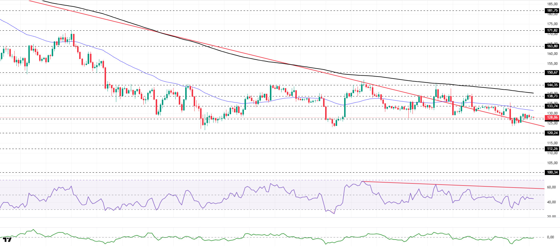 The SOL price has been trading sideways. The asset has remained in the upper region of the downtrend that began on October 6. Currently trading in a narrow band between the downward trend line and the 50 EMA (Blue Line) moving average, the asset could test the 200 EMA (Black Line) moving average as resistance if it experiences an uptrend. In the event of a pullback, the $120.24 level could be monitored.