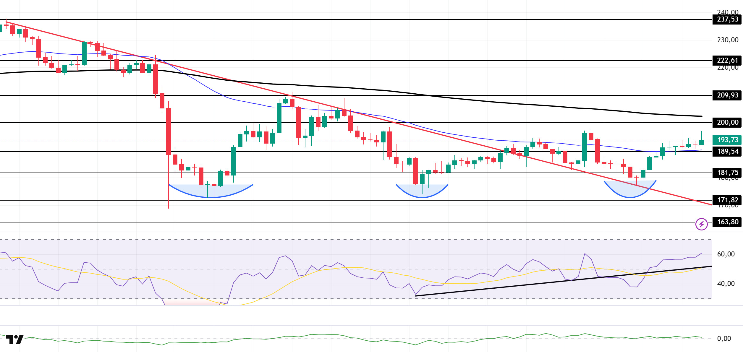 On the 4-hour chart, it remained below the 50 EMA (Exponential Moving Average – Blue Line) and 200 EMA (Black Line). This indicates a possible downtrend in the medium term. At the same time, the price trading between the two moving averages shows us that the asset is in a decision phase in the short term. The Chaikin Money Flow (CMF-20) remained in positive territory. However, a decrease in money inflows could push the CMF into negative territory. The Relative Strength Index (RSI-14) remained in positive territory. It also remained above the downward trend that began on October 17. In the event of an uptrend driven by macroeconomic data or positive news related to the Solana ecosystem, the $200.00 level stands out as a strong resistance point. If this level is broken upwards, the uptrend is expected to continue. In the event of pullbacks due to developments in the opposite direction or profit-taking, the $181.75 level could be tested. A decline to these support levels could increase buying momentum, presenting a potential opportunity for an upward move.