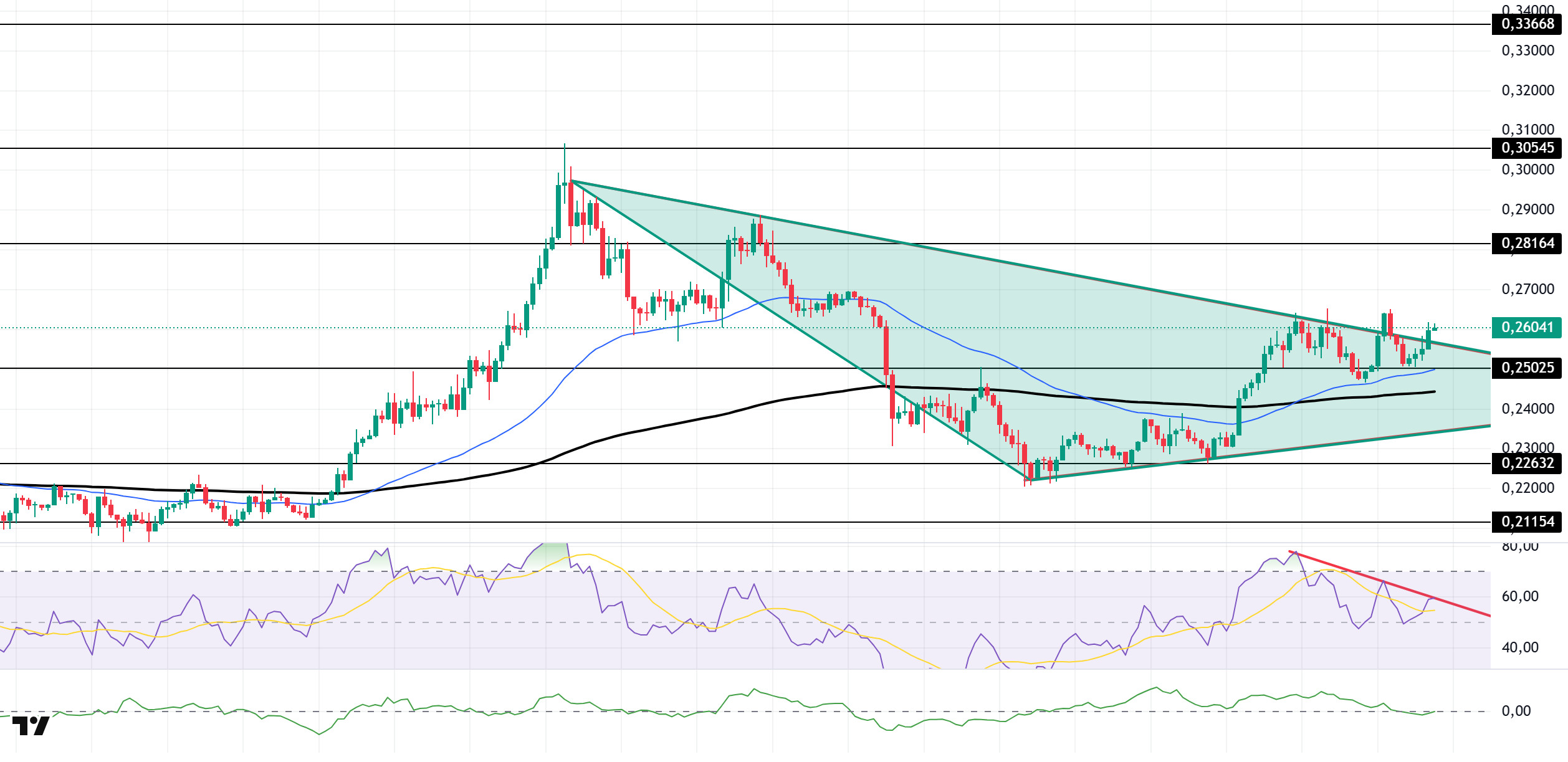 On the 4-hour chart, the 50 EMA (Exponential Moving Average – Blue Line) remained above the 200 EMA (Black Line). This indicates that an uptrend may begin in the medium term. The price being above both moving averages indicates that the price is bullish in the short term. Chaikin Money Flow (CMF-20) experienced a pullback towards the negative zone. Additionally, a decrease in money inflows could push the CMF deeper into the negative zone. The Relative Strength Index (RSI-14) is currently testing the resistance level that began on October 2. If it breaks above this level, buying pressure may increase. In the event of an uptrend driven by political developments, macroeconomic data, or positive news flow in the DOGE ecosystem, the $0.28164 level stands out as a strong resistance zone. Conversely, in the event of negative news flow, the $0.22632 level could be triggered. A decline to these levels could increase momentum and potentially initiate a new upward wave.
