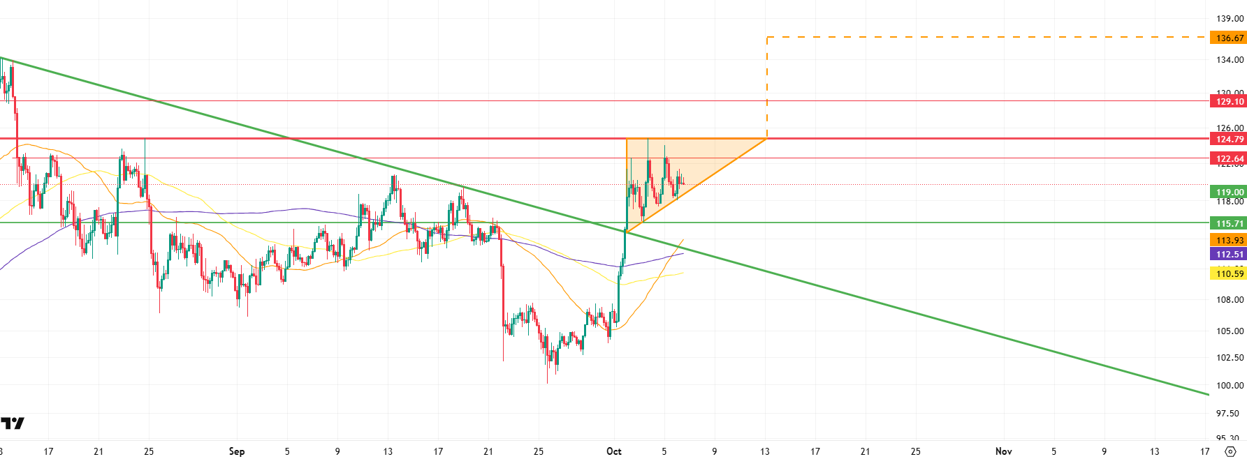 Looking at the technical chart, the chart formation supporting potential upward movements is noteworthy. First, the horizontal resistance level at 122.64 acts as a potential barrier to upward movement. Then, the upper band of the ascending triangle at the 124.79 level emerges as another important resistance point. Breaking the resistance level at 124.79 could complete the ascending triangle formation upward, increasing the potential for movement towards the 136.67 level. However, the first significant test on this journey is expected to be the resistance at the 129.10 level. After a short-term correction at this level, the price could break through and continue its rise towards the target of 136.67.