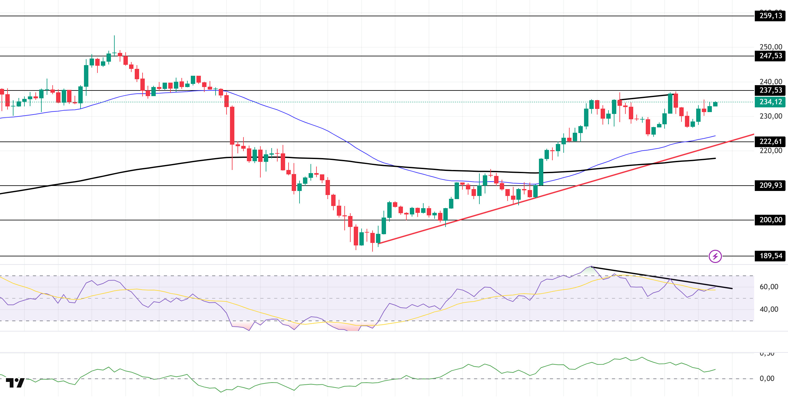 On the 4-hour chart, it has started to trade above the 50 EMA (Exponential Moving Average – Blue Line) and 200 EMA (Black Line). This indicates a possible uptrend in the medium term. At the same time, the price being above both moving averages shows us that the asset is trending upward in the short term. The Chaikin Money Flow (CMF-20) remained in positive territory. However, a decrease in money inflows could push the CMF into negative territory. The Relative Strength Index (RSI-14) also remained in positive territory. At the same time, it continued to be in the lower region of the downward trend that began on October 2. This signaled that the downward pressure was continuing. However, it is currently testing this level as resistance. A break above this level could strengthen the uptrend. However, there is a negative divergence, which could deepen the pullback. If the price rises due to macroeconomic data or positive news related to the Solana ecosystem, the $237.53 level stands out as a strong resistance point. If this level is broken upwards, the uptrend is expected to continue. If pullbacks occur due to developments in the opposite direction or profit-taking, the $222.61 level could be tested. If it retreats to these support levels, an increase in buying momentum could present a potential upside opportunity.