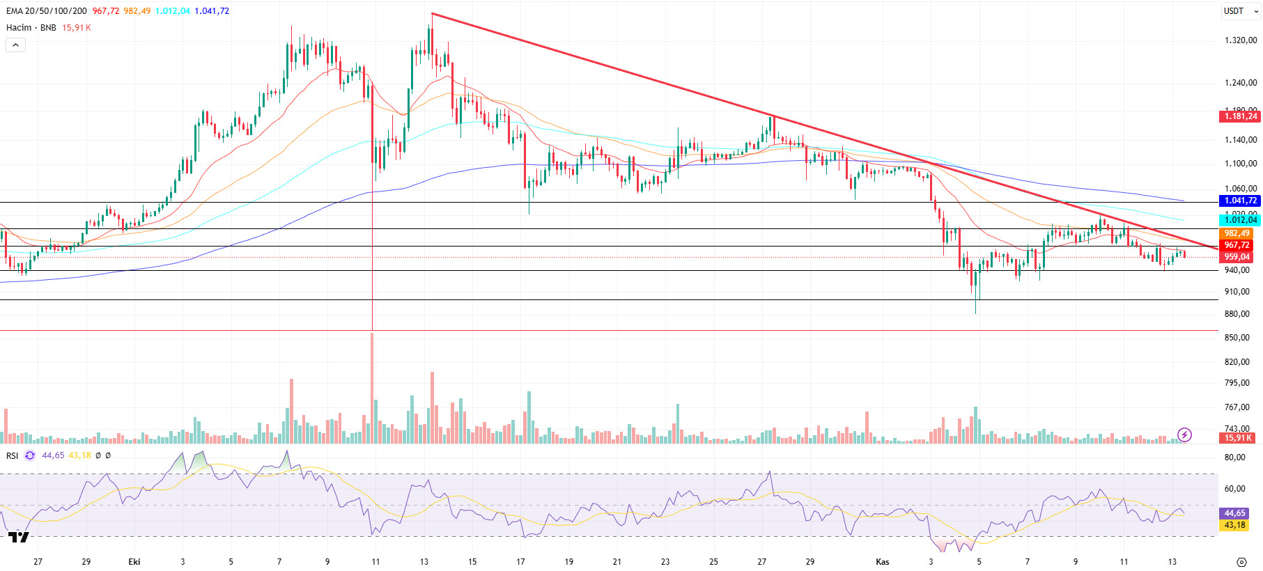 Technical indicators for BNB, currently trading in the $940–975 range, show that the low trading volume in recent periods has limited the positive outlook. However, it is observed that the current volume levels do not have sufficient strength to break the downward trend. Furthermore, although the Relative Strength Index (RSI) indicator briefly rose above the 50 level due to recent purchases, it has resumed a downward trend due to weak momentum.