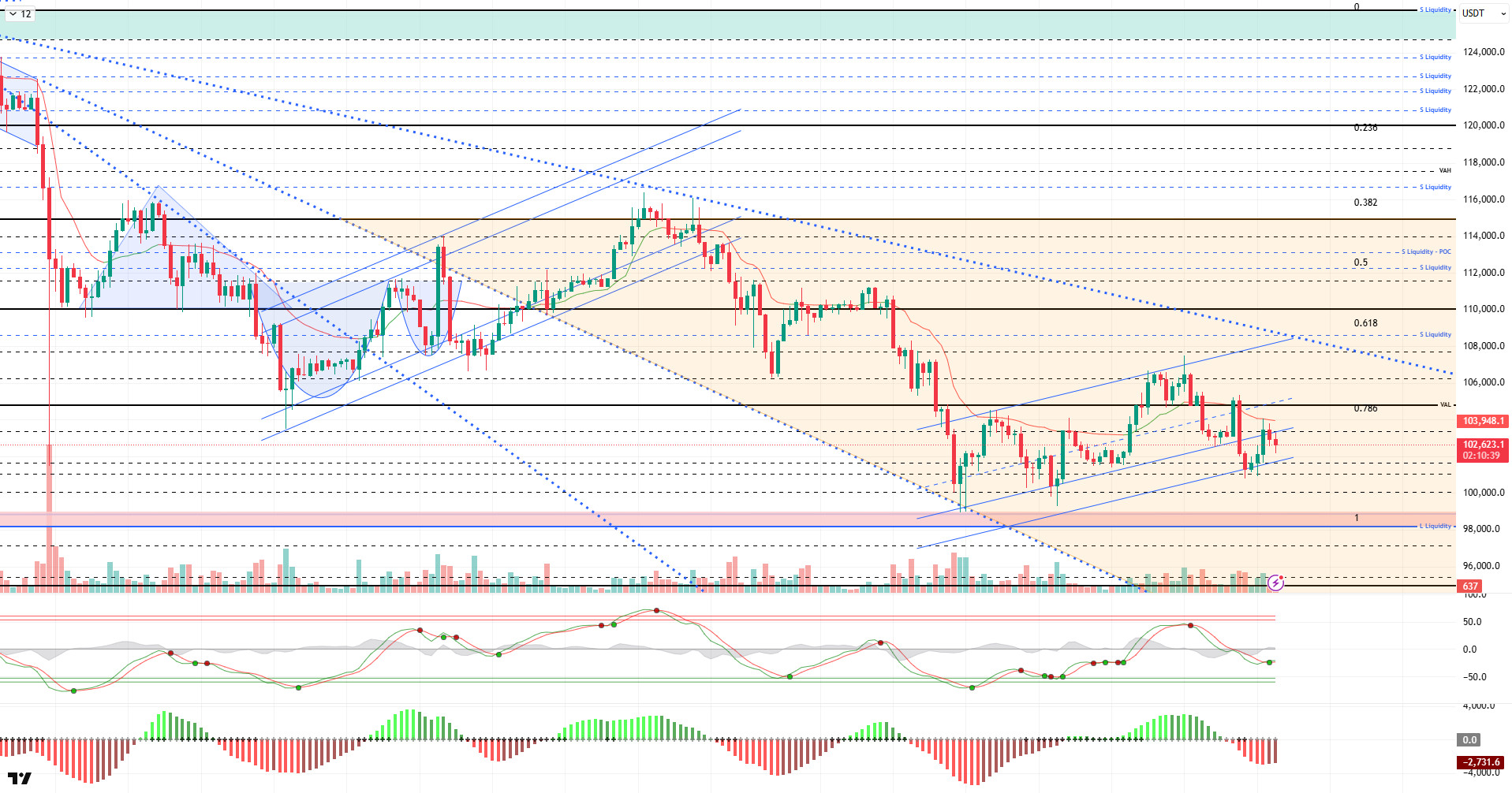 Technical indicators have withdrawn the buy signal given in the middle band of the parallel channel, parallel to the sell signal given by Wave Trend (WT) in the overbought zone, and have given a new buy signal just above the oversold zone. The Momentum (SM) indicator’s histogram continues its momentum within the negative zone. The Kaufman Moving Average (KAMA) is currently at $103,900, positioned above the price.