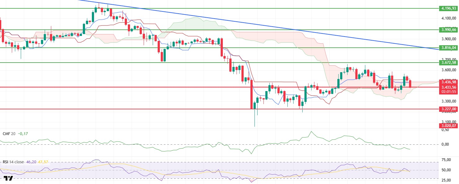Technically, the $3,436 level stands out as the critical support level for the day. If the negative indicators persist, losing this level could accelerate selling pressure and cause the price to fall to the $3,300 level. However, if the $3,436 level is maintained, limited rebound buying could be seen, and the price could initiate a recovery movement back towards the $3,510 level.