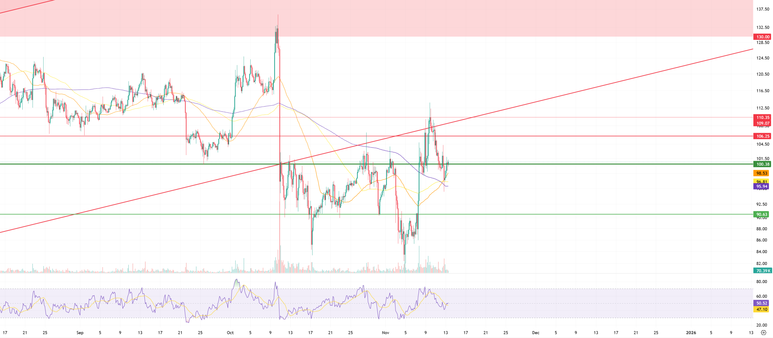 If a decline in line with expectations occurs, the 100.38 level stands out as an area where the price could initially find support and short positions could be partially closed. If the price remains below this level, the 200, 100, and 50-period moving averages (purple, yellow, and orange), which are quite close to each other on the chart, could provide short-term support for the price. However, if we had to specify a single level, the 95.94 level, where the 200-period average passes, is a critical support level. Below this, the threshold support level of 90.63 could potentially pave the way for more severe price movements. Nevertheless, a break below all these moving averages ( ) and a pullback to the last support level would only become more likely if a strong downward trend develops across the market.