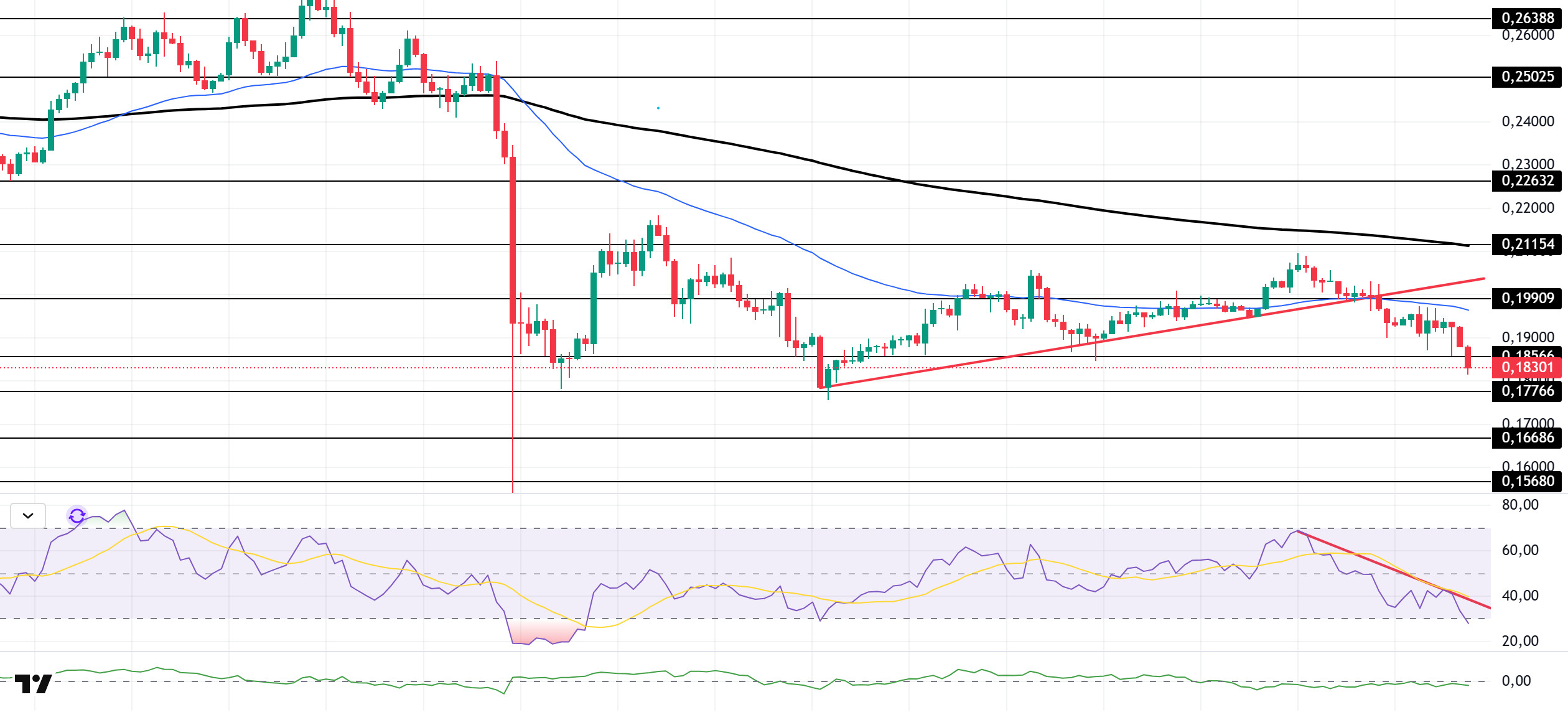 The Relative Strength Index (RSI) has fallen to the 40 level, supporting the view that the market is experiencing weakening momentum in the short term. This value indicates that selling has begun to become somewhat excessive, but that a strong buyback signal has not yet formed. The RSI continuing to trade below the 50 level confirms that sellers are still dominant. The current outlook is moving towards the risk scenario we predicted in this morning’s analysis. While regaining $17.70 could create a positive recovery ground, as long as it remains below this level, the downtrend is likely to continue towards the $16.52–15.95 range.